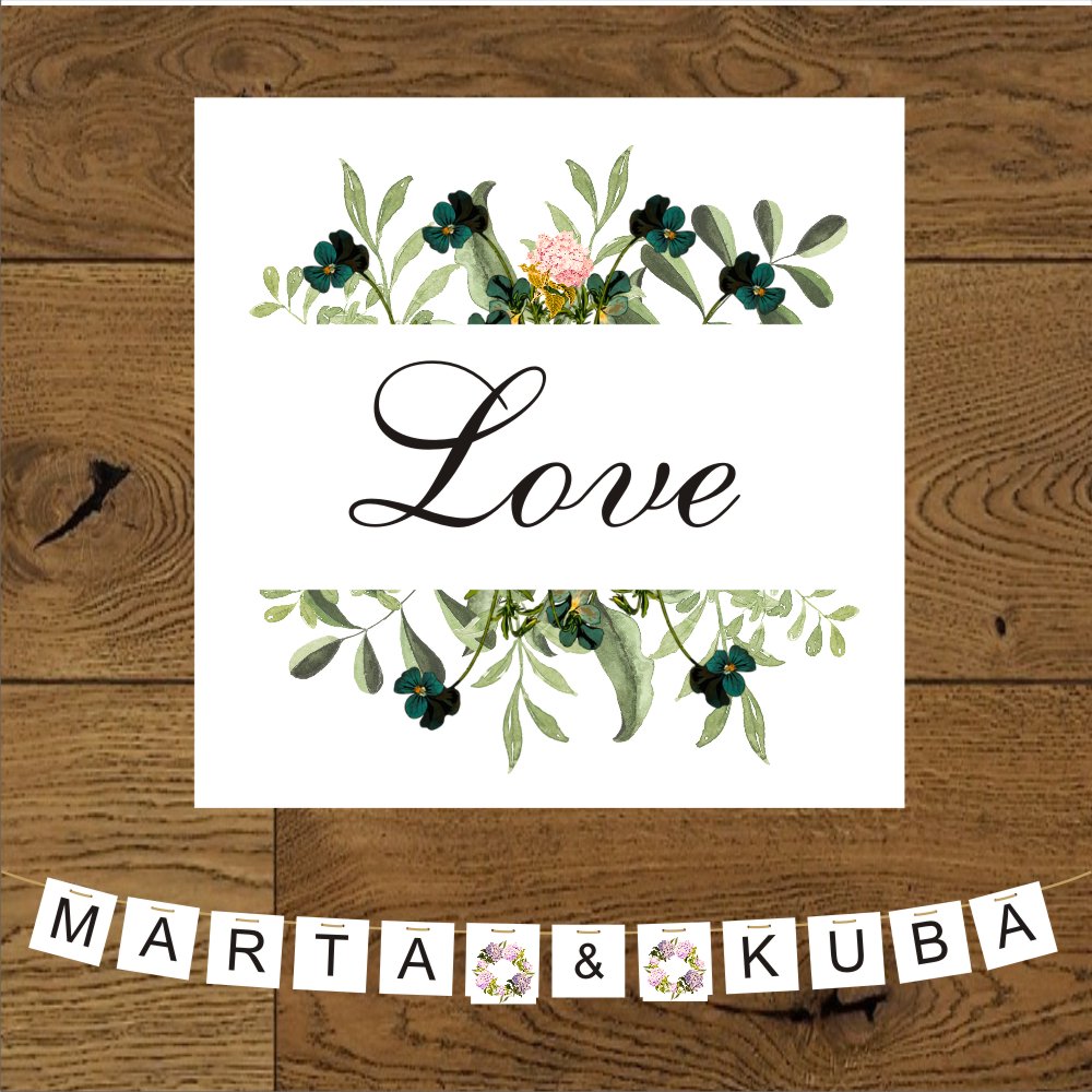 Baner weselny w kolorach zieleni i szmaragdowych kwiatów.