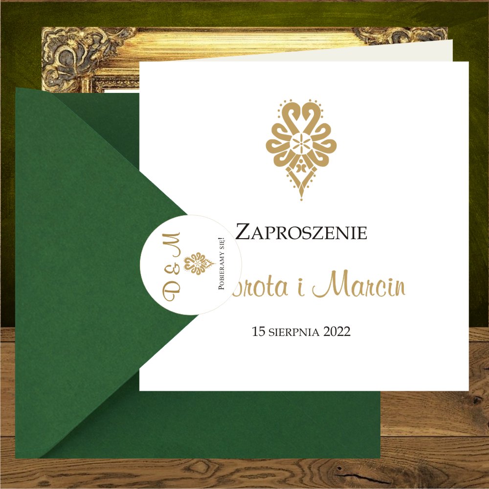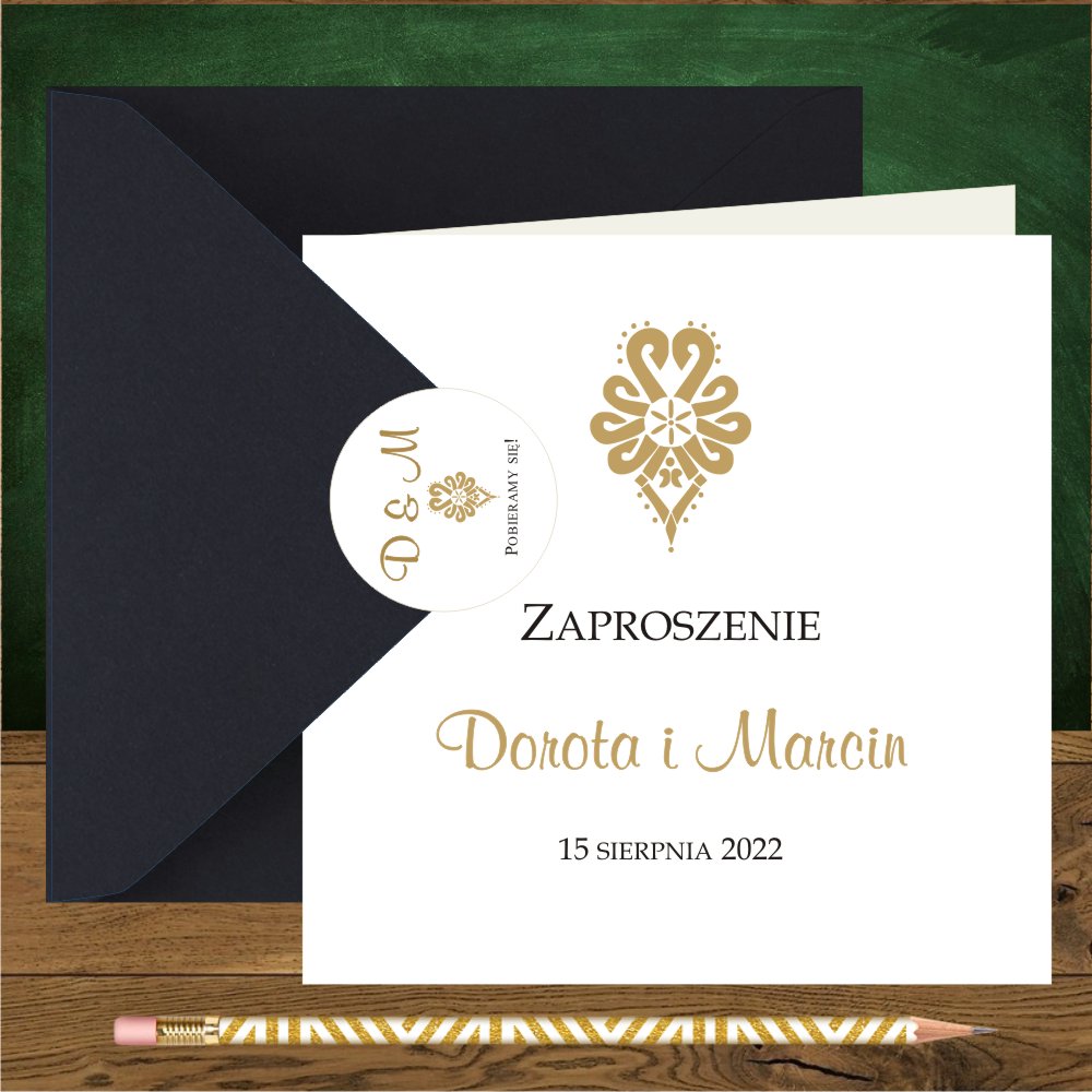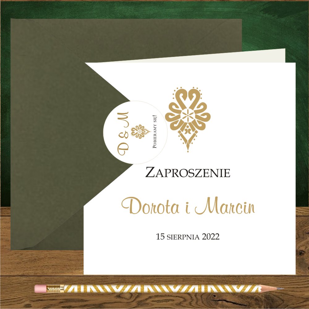 Zaproszenia na wesele góralskie – zaproszenia weselne – góralskie wesela są huczne i tradycyjne z ocepinami , gdzie Pannie Młodej zakłada się chustę tzw. kaźmierkule co symbolizuje zmianę stanu cywilnego. Panu Młodemu kradnie się pióro z kapelusza, które później musi wykupić. Coraz częściej pary decydują się na wesele w górach z cudownymi motywami góralskimi , najbardziej popularny to parzenica, haft do zdobienia portek podhalańskich. Do stworzenia tych bardzo nietypowych góralskich zaproszeń użyliśmy białego jakościowego papieru. Kwadratowe zaproszenie jest otwierane. Na środku prześliczny złoty wzór parzenicy, użyte czcionki to złota i czarna. Papeteria w stylu góralskim nowocześnie łączy się z kolorowymi kopertami : ecru, zielona, butelkowa zieleń, bordo, złoto. Zaproszenie ze złotą metalizowaną kopertą wygląda zjawiskowo, a z bordową obłędnie, dopełnieniem koperty jest dodatkowa śliczna okrągła naklejka na kopertę z folkowym ornamentem. Zaproszenie może być personalizowane w środku lub na kopercie.