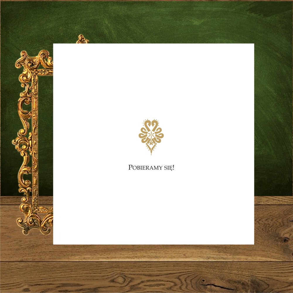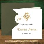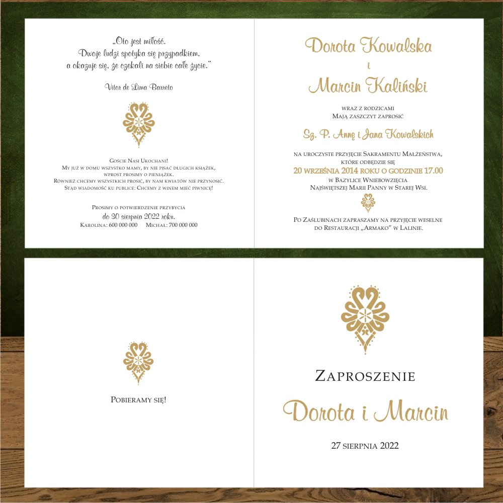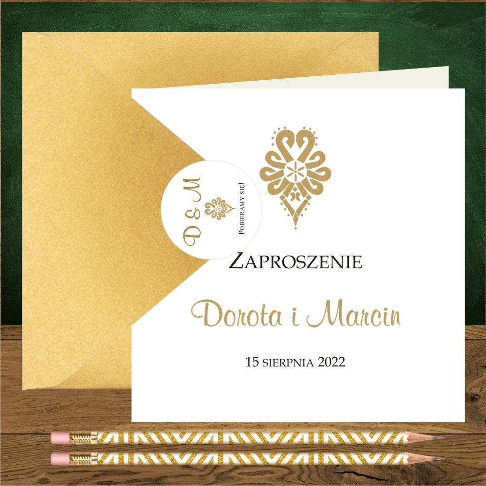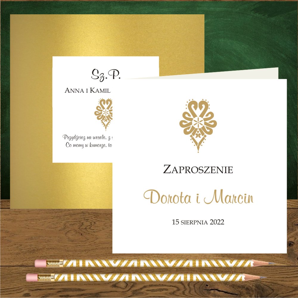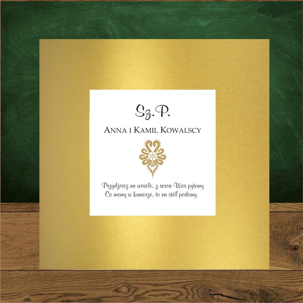 Zaproszenia na ślub góralskie z góralską parzenicą. Parzenica złota, proste