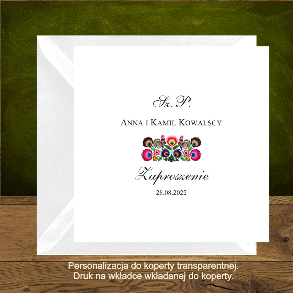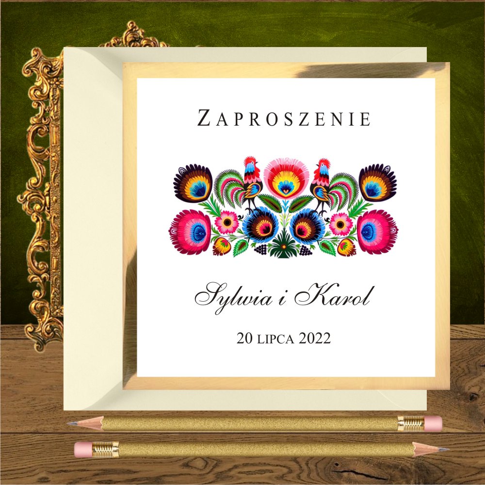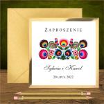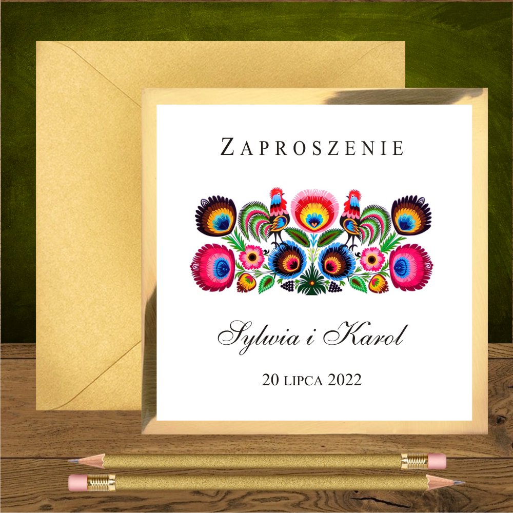 Zaproszenia na ślub i wesele w folkowym stylu, kwadratowe, proste. Folkowe
