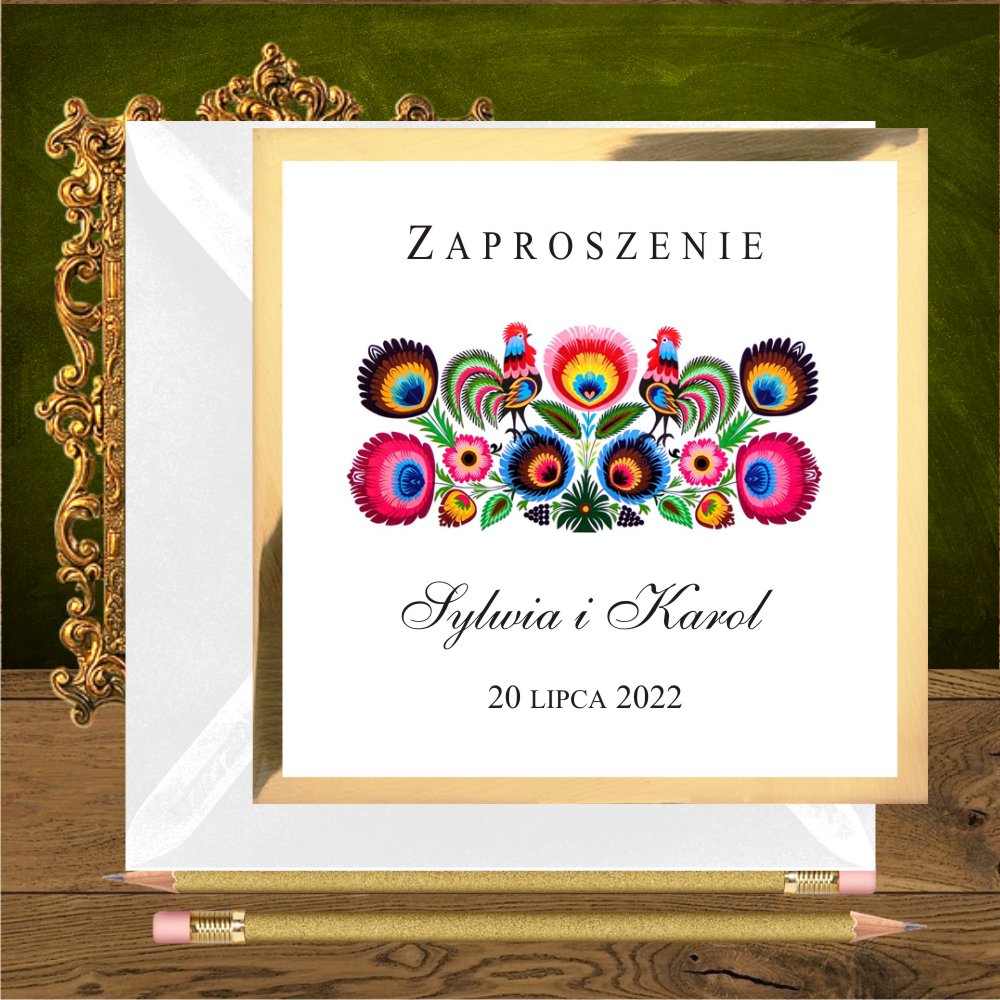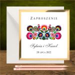 Zaproszenia ślubne folkowe z motywem ludowym na złotym kartoniku. Folkowe