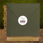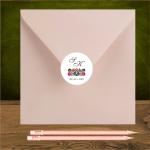 | Naklejka na kopertę w kształcie kółeczka. Wykonana z papieru takiego jak użyty w zaproszeniach.W przykładzie koperta różowa nude |