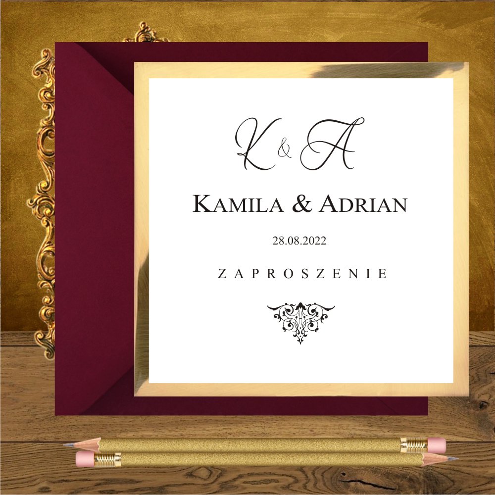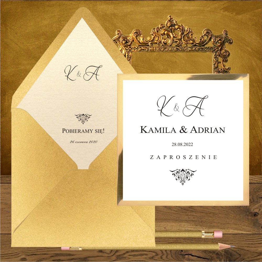 Eleganckie, stylowe złoto czarne zaproszenia na ślub wykonane z papieru białego i złotego. Na froncie widnieje oryginalny ornament.  Wzór bardzo nowoczesny i minimalistyczny