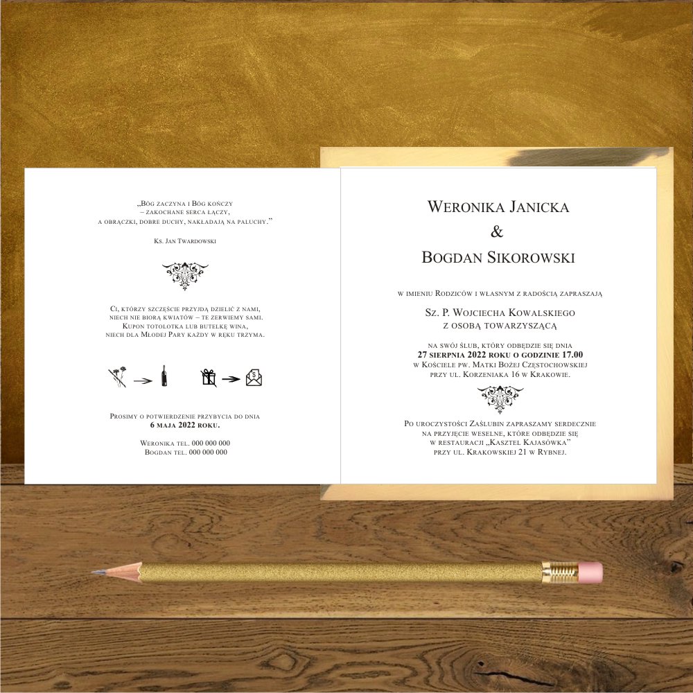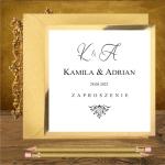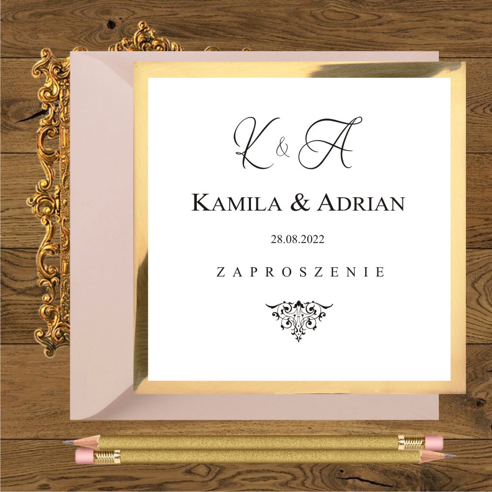 Eleganckie, stylowe złoto czarne zaproszenia na ślub wykonane z papieu białego i złotego. Na przodzie oryginalny ornament. Elegancji dodaja koperty w kolorze srebrnym i złotym. Bardzo ciekawy efekt uzyskujemy wybierając kopertę zieloną, rózową czy bordo. Na okładce zaproszenia widnieją inicjały pisane ozdobną czcionką, mimo to zaproszenie ma charakter minimalistyczny.
