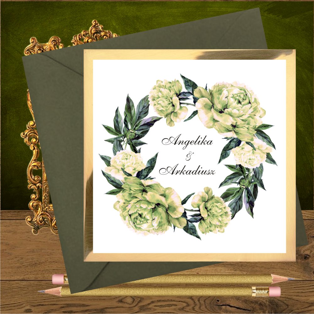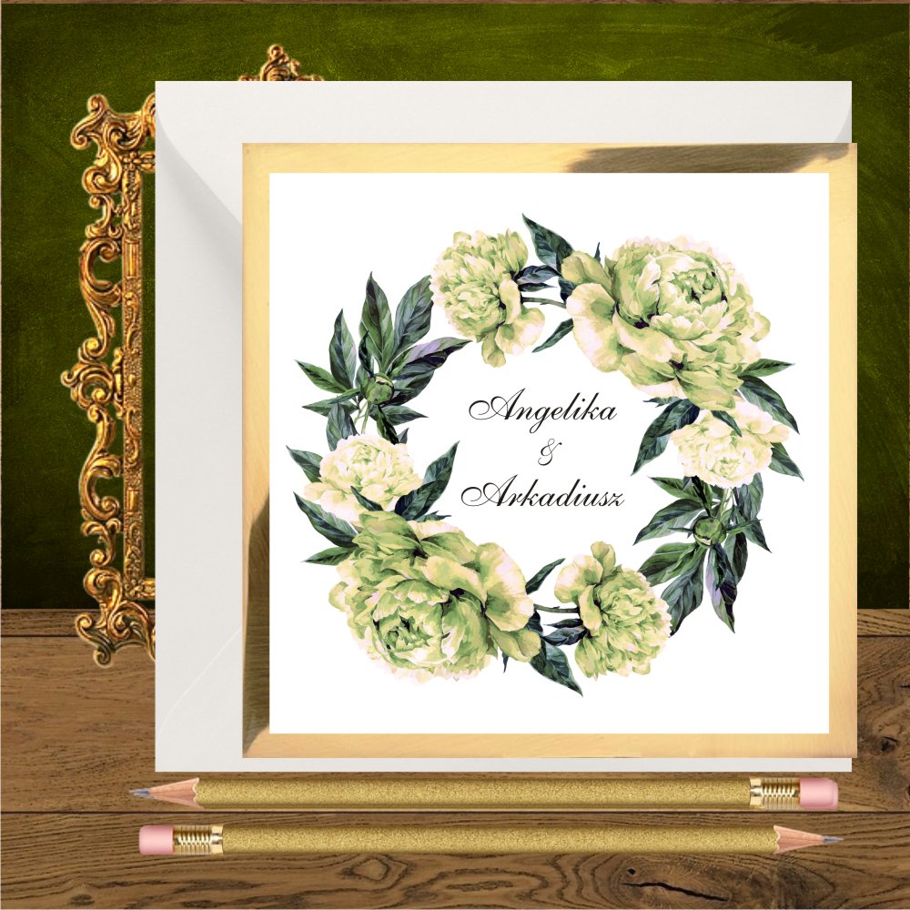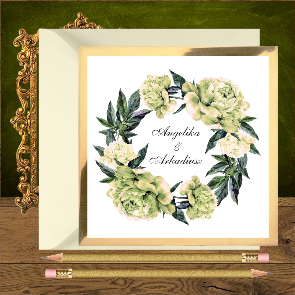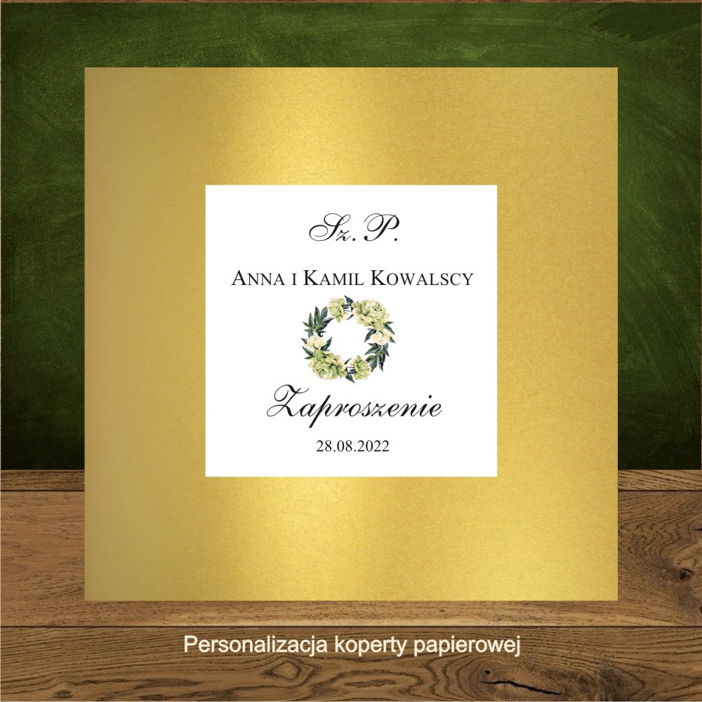 Opis: zaproszenia weselne wykonane z pięknego złotego papieru i białego gładkiego. Na froncie wianek z piwonii w kolorze zielonkawego ecru. Najpiękniejsze połączenie jest z kopertą w kolorze butelkowej zieleni. Dobrze wygląda też koperta transparentna, ecru, biała i złota.