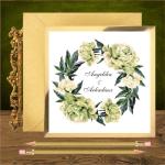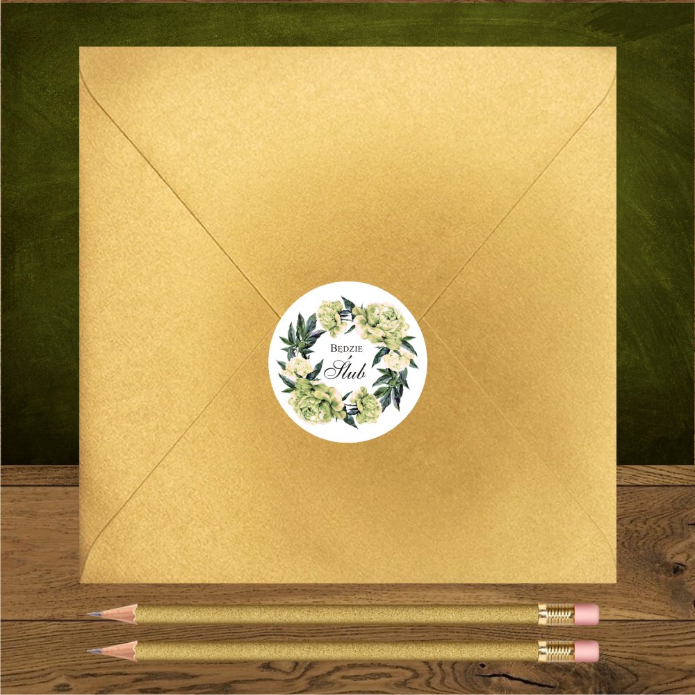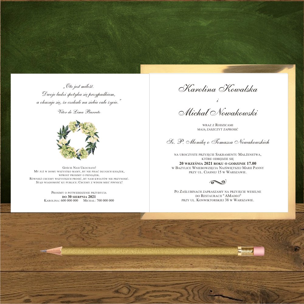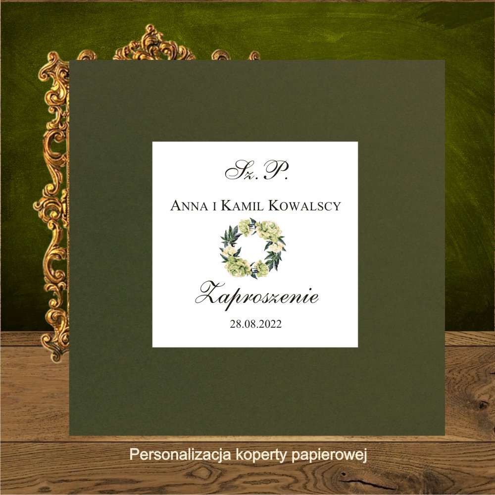 Opis: zaproszenia weselne wykonane z pięknego złotego papieru i białego gładkiego. Na froncie wianek z piwonii w kolorze zielonkawego ecru. Najpiękniejsze połączenie jest z kopertą w kolorze butelkowej zieleni. Dobrze wygląda też koperta transparentna, ecru, biała i złota.