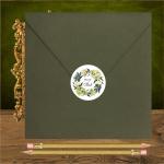 | Naklejka na kopertę w kształcie kółeczka. Wykonana z papieru takiego jak użyty w zaproszeniach.W przykładzie koperta w kolorze butelkowej zieleni |