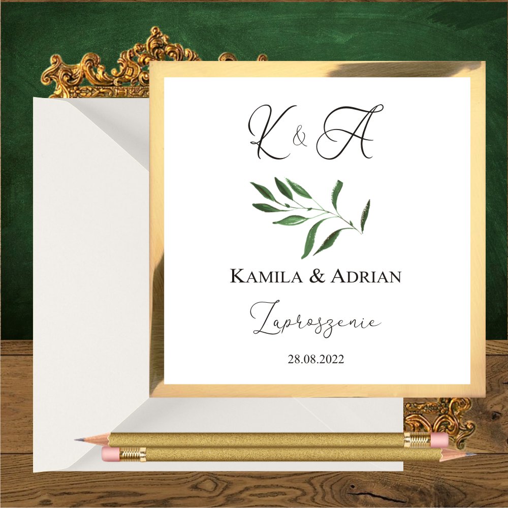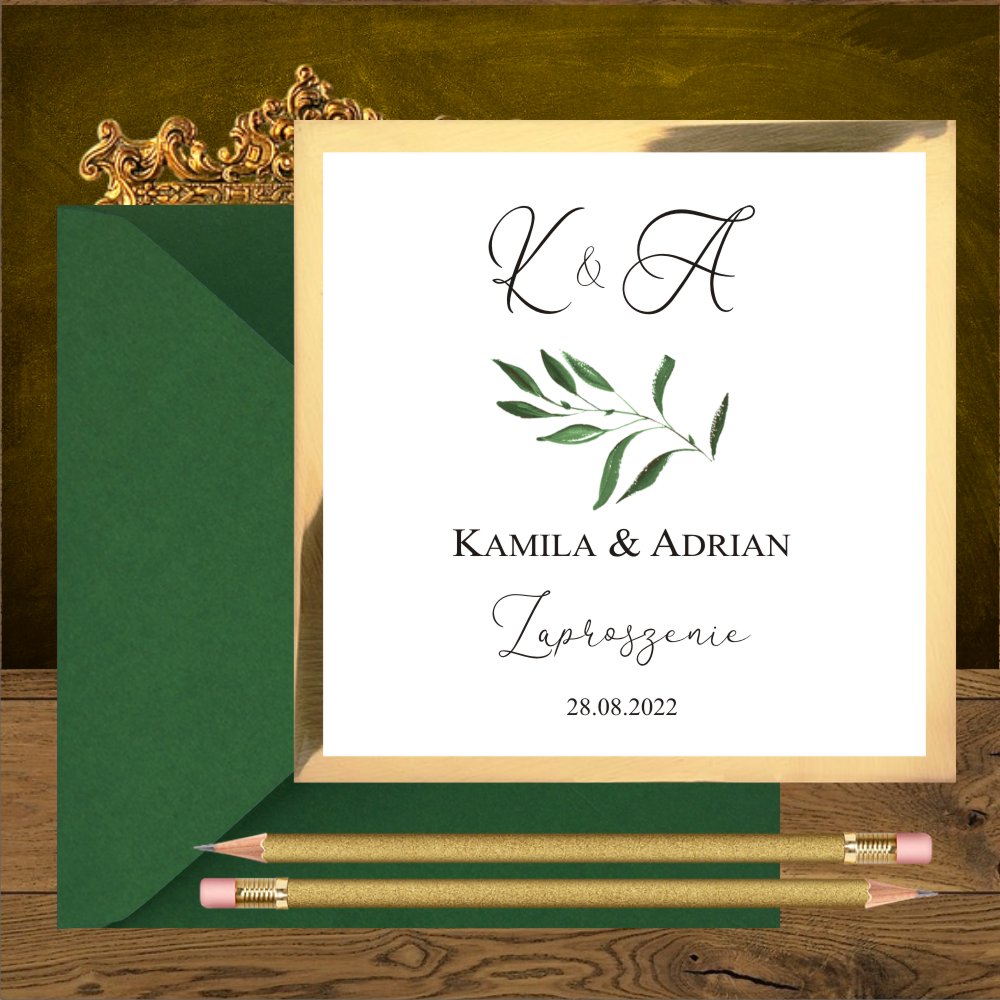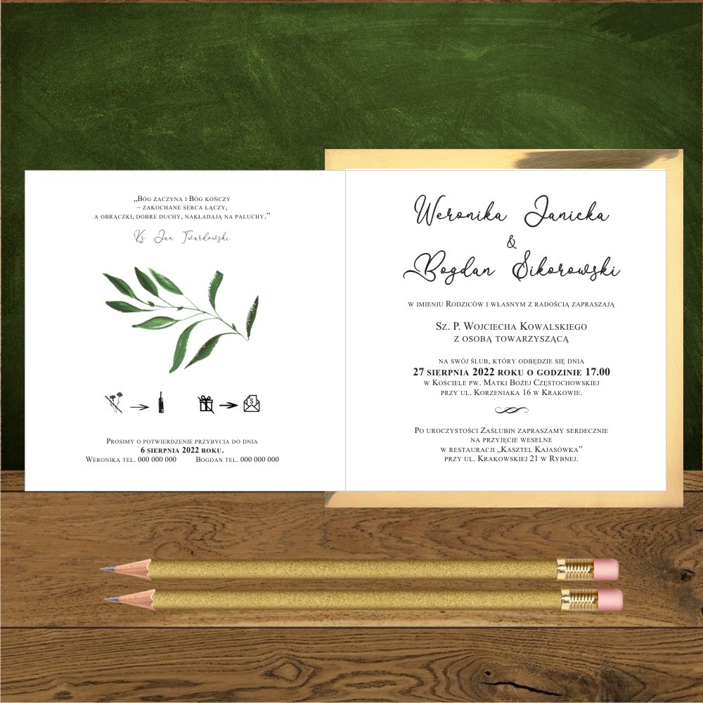 Zaproszenia ślubne rustykalne z zielonymi gałązkami. Kwadratowe proste. Fantazyjna czcionka. Zielone galązki delikatne