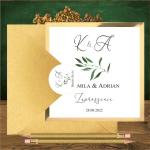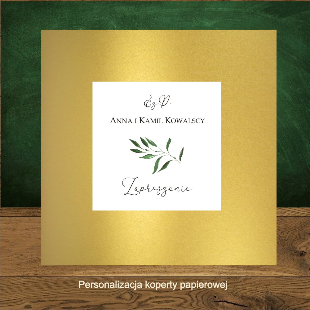 Zaproszenie ślubne w stylu rustykalnym z elementami stylu glamour. Ten wzór zaproszeń będzie idealny w przypadku luksusowych ślubów glamour, boho lub rustykalnych. Zaproszenie jest bogato zdobione złotą błyszcząca podklejką. Pięknie wygląda z kopertą zieloną i złotą. Dopełnieniem koperty jest dodatkowa piękna naklejka na kopertę z inicjałami i zieloną gałązką. Zaproszenie może być personalizowane w środku lub na kopercie.