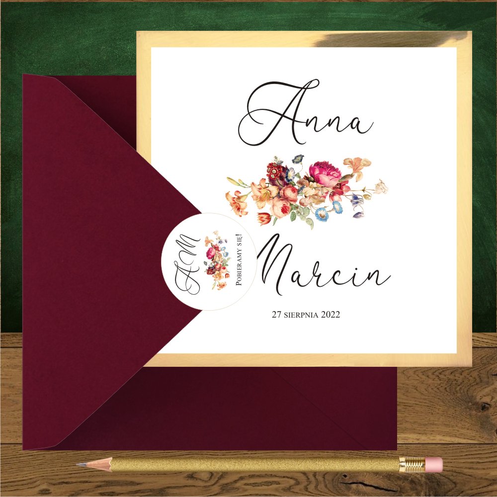 Zaproszenia ślubne w stylu boho z elementami błyszczącego złota , kwiaty w bukiecie łączą nowoczesność z tradycją. Kolory bordo, delikatny błękit, zgaszona zieleń nawiązują do natury, co odzwierciedla luźna kompozycja. Zaproszenia są wykonane z pięknego aksamitnego papieru podklejonego błyszczącym lustrzanym złotym kartonikiem. Niebanalna czcionka nadaje zaproszeniom stylu. Do wyboru koperty w kolorze pastelowego różu, różowy nude ,biała, ecru, złota, bordo. Szczególnie pięknie prezentuje się z koperta bordo i złota. Zaproszenie może być personalizowane w środku lub na kopercie.