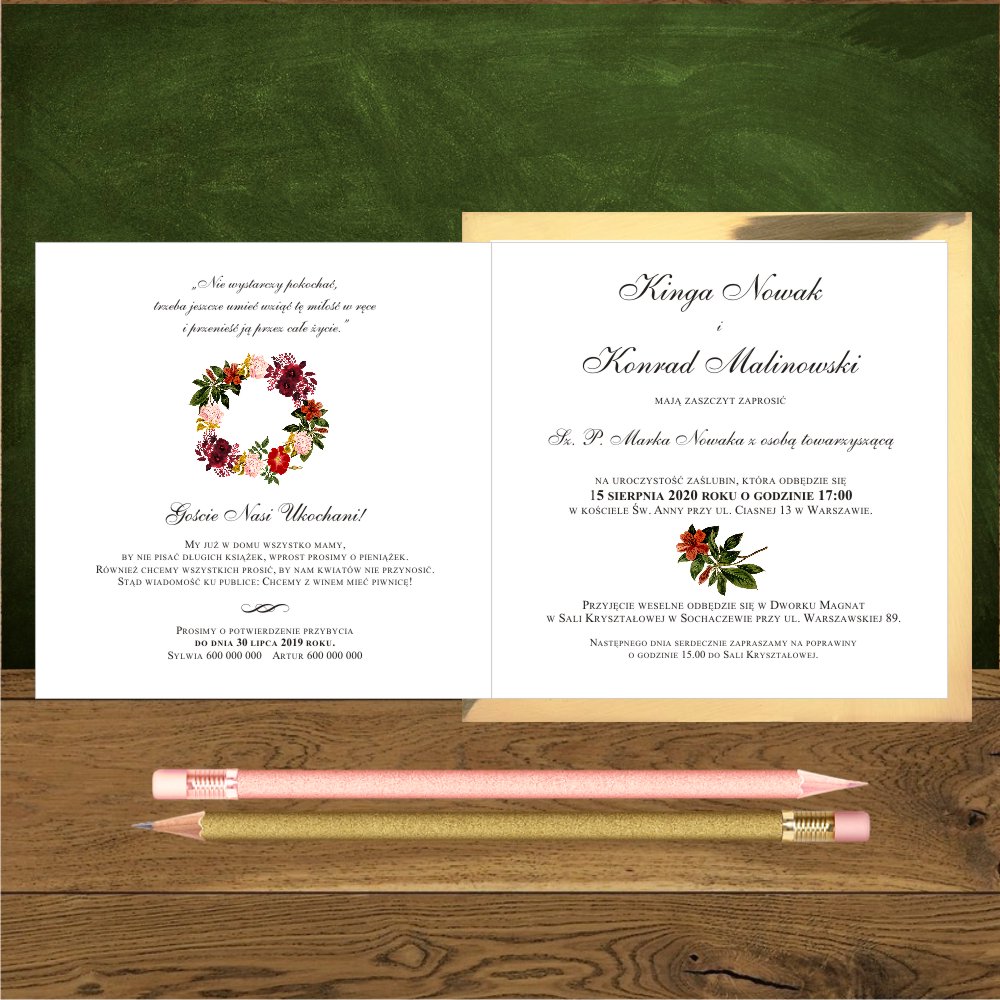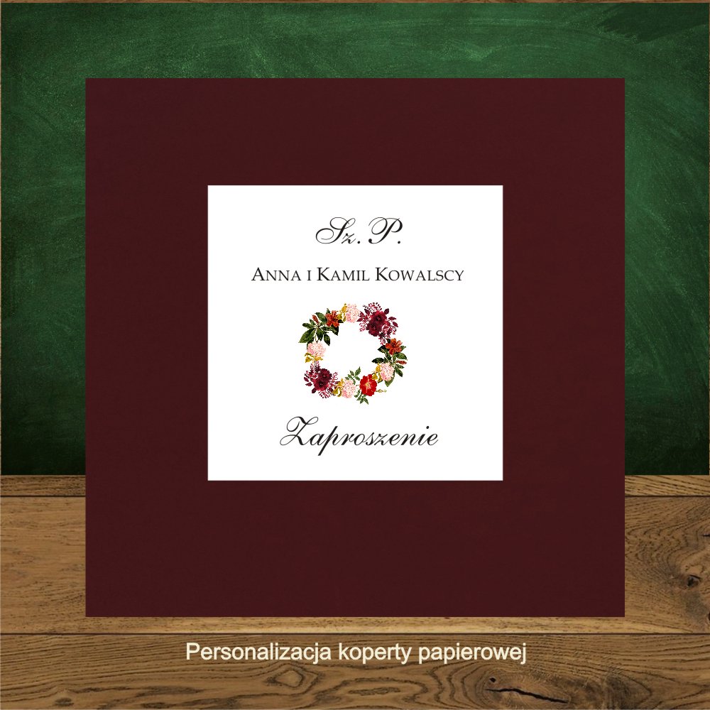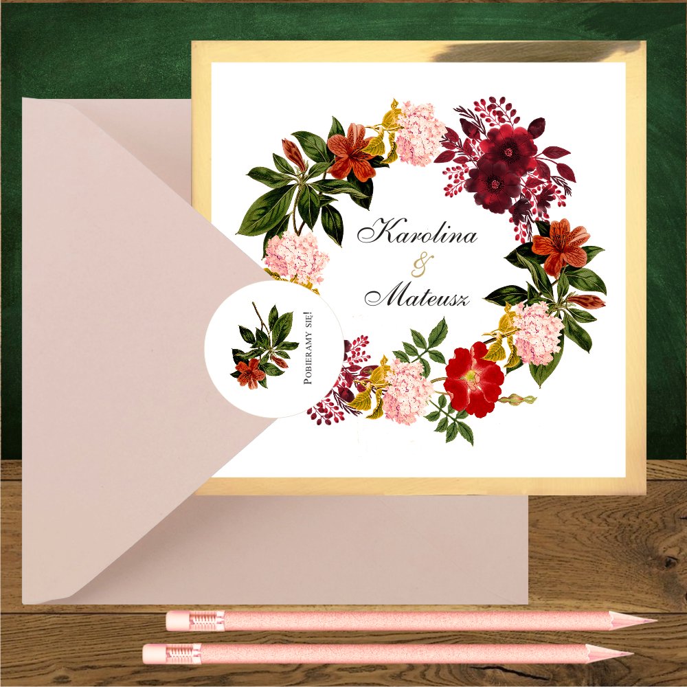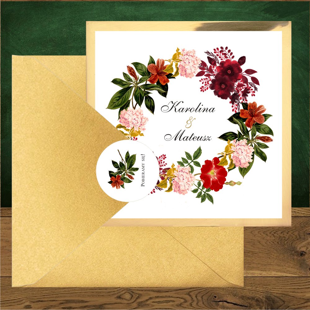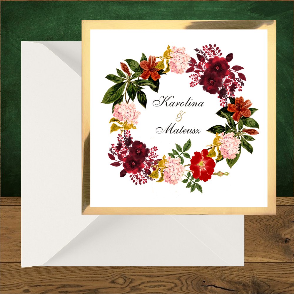 Zaproszenia ślubne boho na złotym kartoniku, kwadratowe. Wianek kwiaty bordo