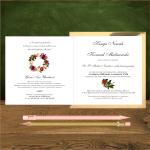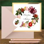 Mocniejsze trendy – zaproszenia, zawiadomienia na ślub w plenerze lub cywilny. Niecodzienny dobór kolorów to kwiaty w wianku w kolorach bordo marsala, czerwieni, pastelowego różu hortensji. Liście w kolorze zgaszonej zieleni, lekko złote. Do stworzenia tych bardzo eleganckich zaproszeń użyliśmy złotej, lustrzanej, grubej podklejki oraz białego jakościowego papieru. W papeterii ślubnej i wszystkich dodatkach, które wykorzystacie do dekoracji sali warto używać dużo złota, niech będzie na bogato. Kwadratowe zaproszenie jest otwierane. Popularność całych białych wesel maleje, suknie ślubne są śmietankowe, beżowe, wiązanki imponujące rozmachem i jesienną kolorystyką dlatego koperty w kolorze pudrowego różu, złote metalizowane, bordo to obecnie najmodniejsze trendy w zaproszeniach. Do zaproszenia pasuje koperta w kolorze różu nude, natomiast z kopertą bordową zaproszenie jest ekskluzywne, dopełnieniem koperty jest dodatkowa śliczna okrągła naklejka na kopertę z kwiatowym monogramem. Zaproszenie może być personalizowane w środku lub na kopercie.