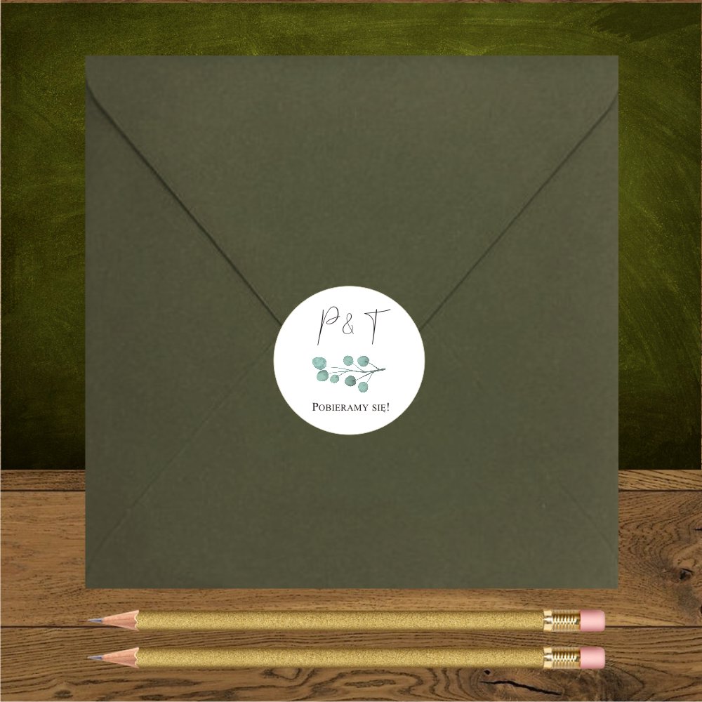 Naklejka na kopertę w kształcie kółeczka. Wykonana z papieru takiego jak użyty w zaproszeniach.W przykładzie koperta w kolorze zieleni butelkowej. Motyw gałązki eukaliptusa na naklejce. |