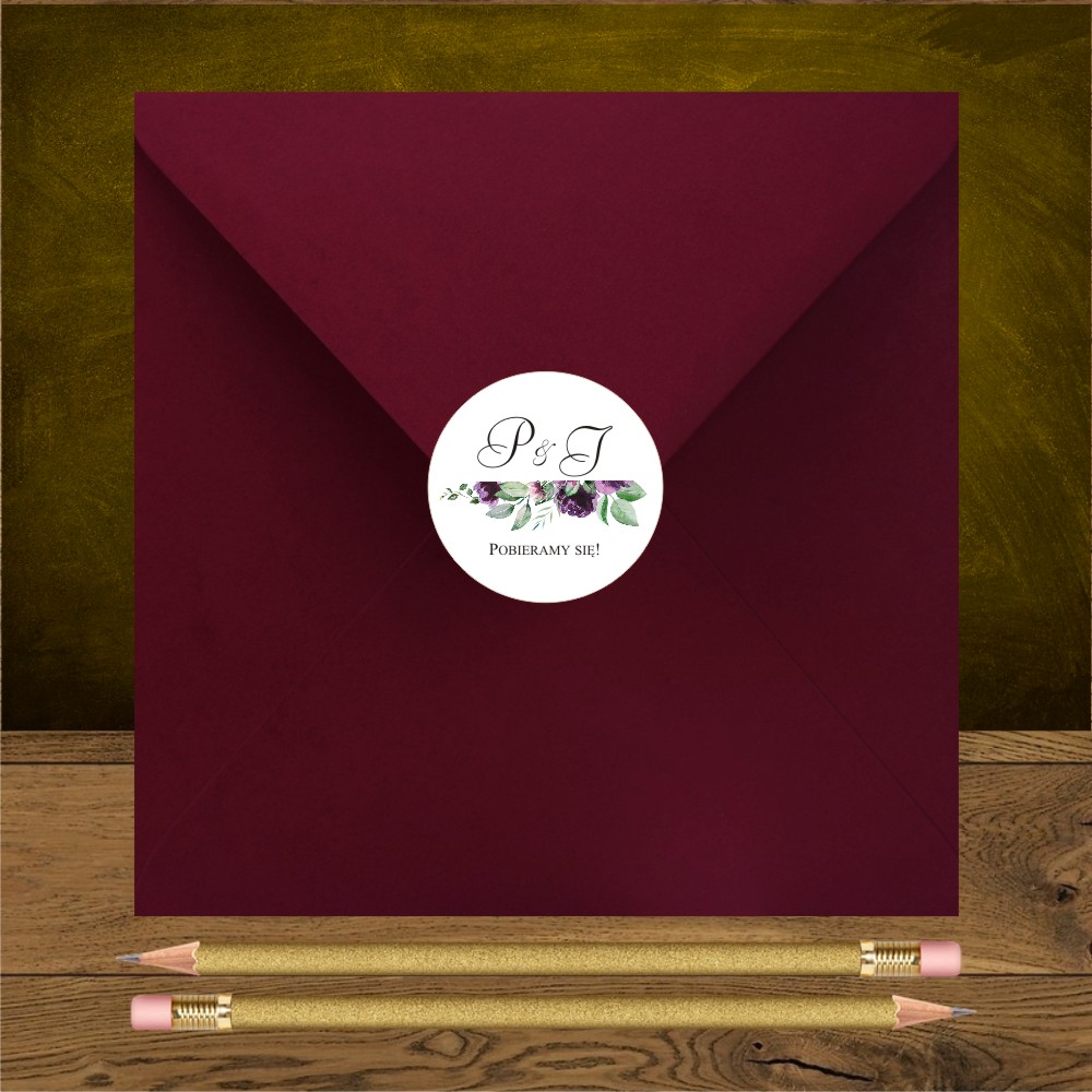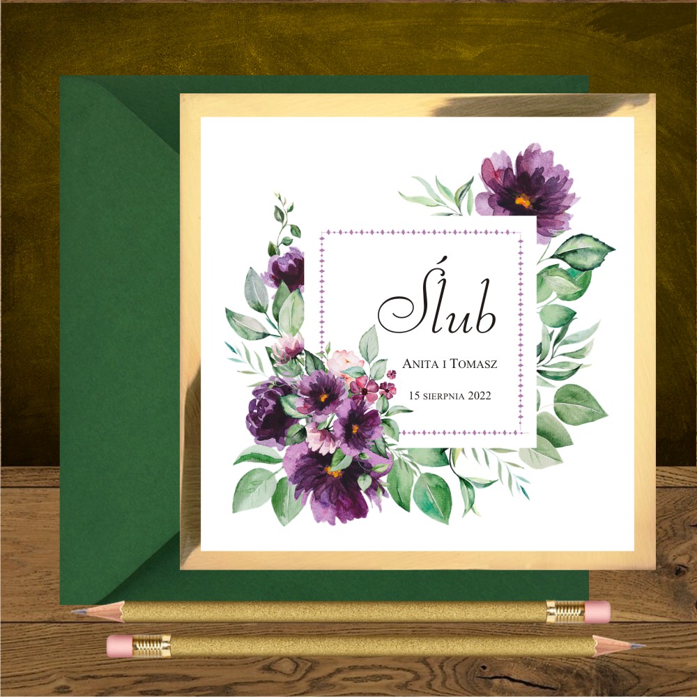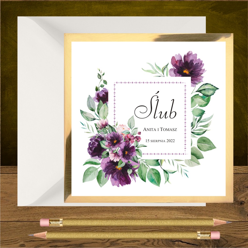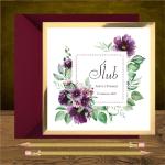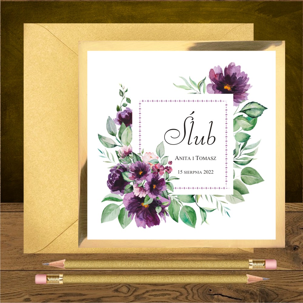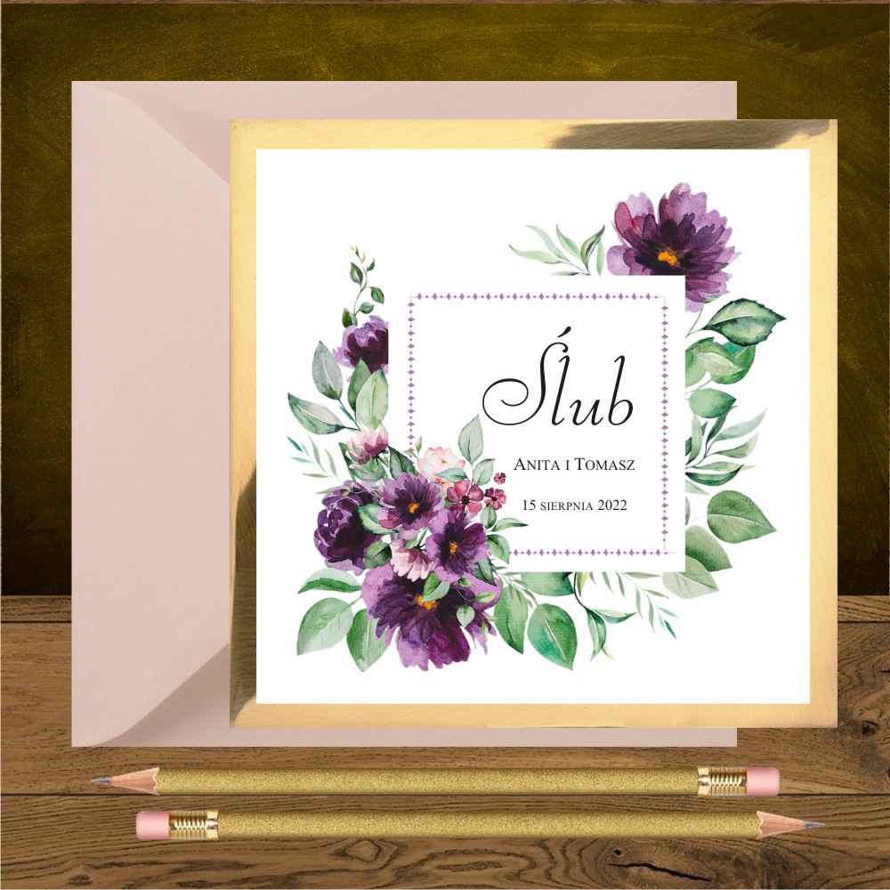 Opis: zaproszenia wykonane z pięknego złotego papieru i białego gładkiego. Na froncie oryginalne kwiaty w kolorze fioletowym i zielone gałązki ułożone w fantazyjny wzór. Zaproszenie w stylu boho, rustykalnym, ekskluzywne.