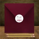 | Naklejka na kopertę w kształcie kółeczka. Wykonana z papieru takiego jak użyty w zaproszeniach. W przykładzie koperta bordo |