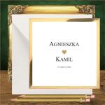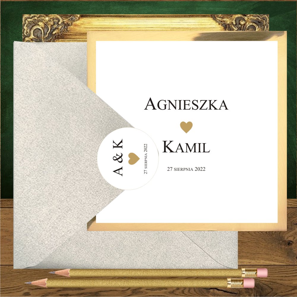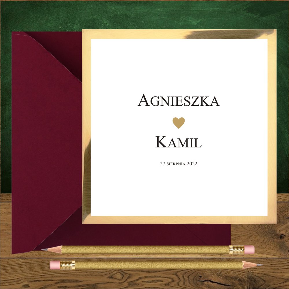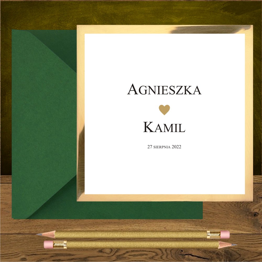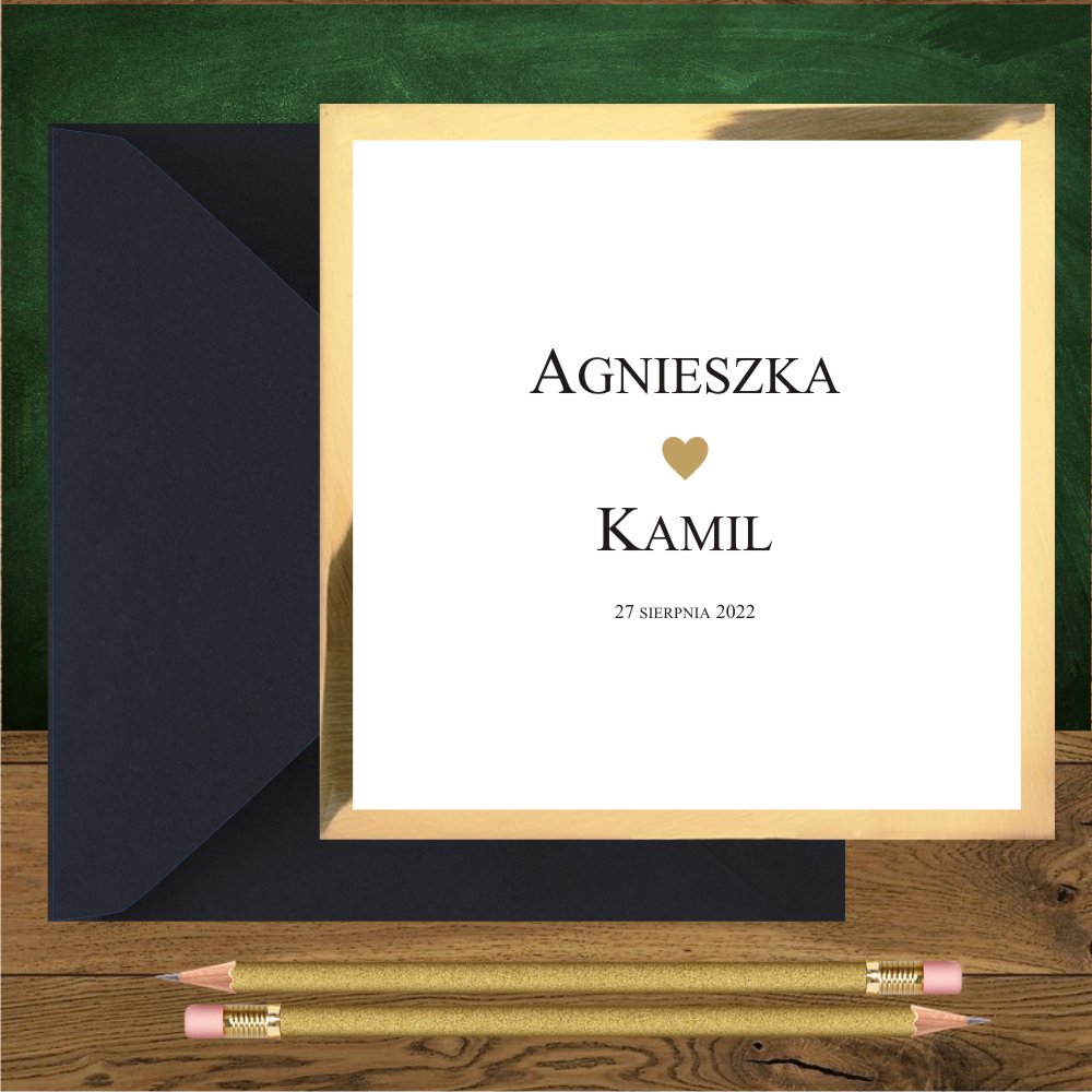 Zaproszenia ślubne minimalistyczne, proste, kwadratowe. Serduszko złote mini i inicjały