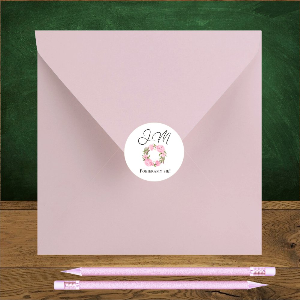 Naklejka na kopertę w formie kółeczka z inicjałami Państwa Młodych, datą ślubu i grafiką różowych piwonii. W przykładzie koperta różowa. |