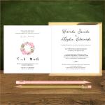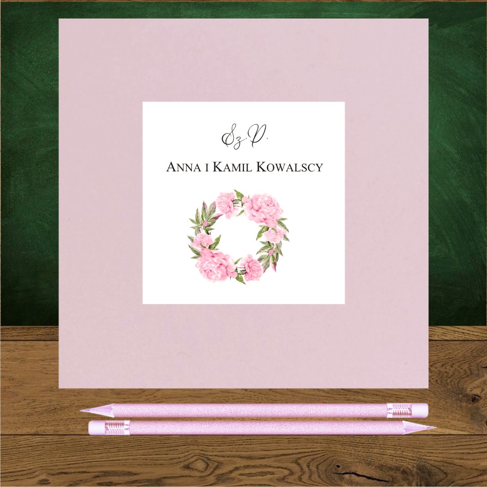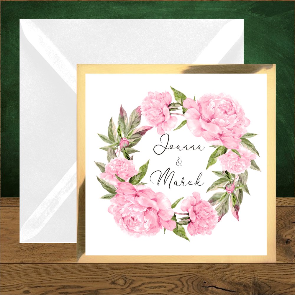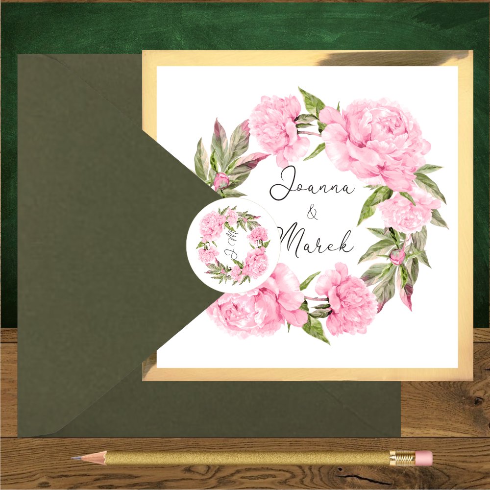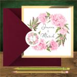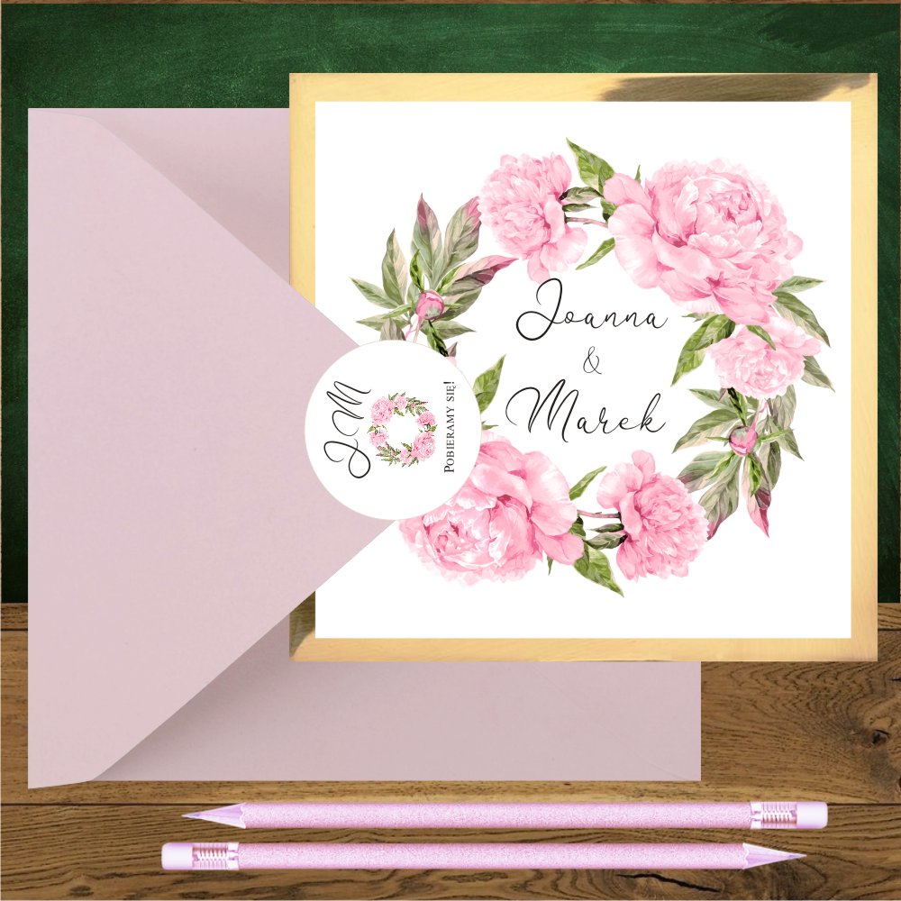 Zaproszenia ślubne do kościoła lub na ślub cywilny – to zaproszenia boho, kwiatowe z pięknym dużym wiankiem dorodnych różowych piwonii i delikatnych zielonych liści dla romantyków marzących o ślubie rustykalnym w ogrodzie. Zaproszenia czy zawiadomienia są wykonane z pięknego białego papieru podklejonego sztywnym lustrzanym złotym kartonikiem, Luksusowy połysk podklejki zmienia charakter zaproszenia na bardziej eleganckie. Zaproszenia ślubne boho z motywem różowych piwonii pasują cudownie do kopert różowych Wyjątkowo oryginalnie zaproszenie prezentuje się ze złotą lub bordową kopertą oraz okrągłą naklejką z uroczym wianuszkiem. Zaproszenie może być personalizowane w środku lub na kopercie.
