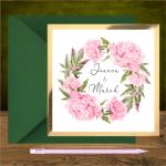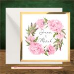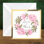Zaproszenia ślubne z różowymi piwoniami. Kwadratowe na złotym kartoniku. Piwonie romantyczny różowy