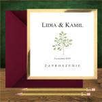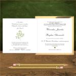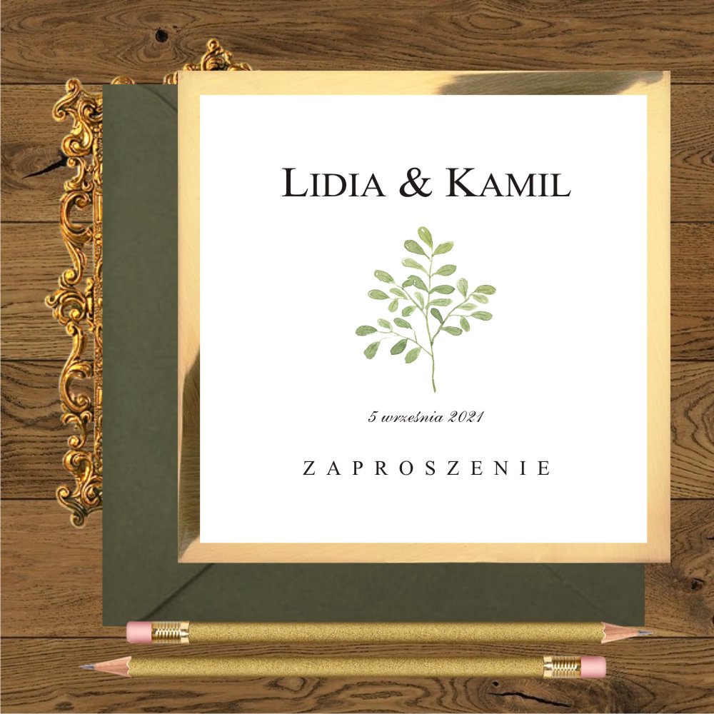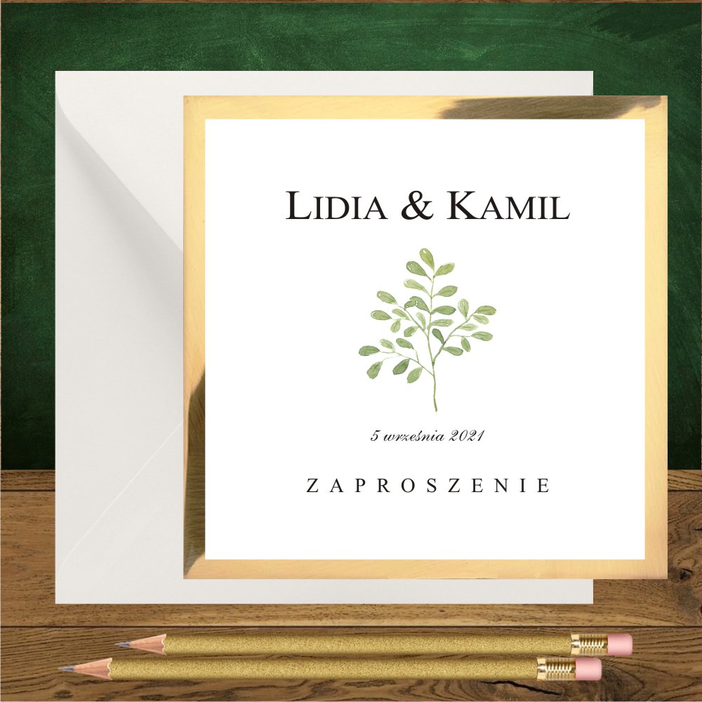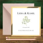 Zaproszenie na ślub z motywem subtelnej zielonej galązki. Wzór o charakterze rustykalnym, boho wykonany z papieru białego i złotego błyszcżącego jak lustro.