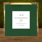 Zaproszenia ślubne złoto zielone rustykalne z elementami glamour. Zielone listki i serduszko mini na mirror