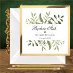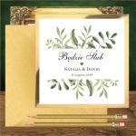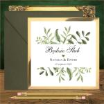 Zaproszenie ślubne– robione na zamówienie z zielonymi listkami i zielonym malutkim serduszkiem to oryginalne zaproszenia dla par marzących o ślubie w stylu boho lub rustykalnym. Dodatki ślubne z tym samym roślinnym motywem świetnie sprawdzą się na sali weselnej rustykalnej, ale też doskonale w eleganckiej restauracji glamour w kolorystyce złota i zieleni. Zaproszenia, zawiadomienia są wykonane z pięknego białego papieru podklejonego sztywnym lustrzanym złotym kartonikiem. Zaproszenia ślubne boho z motywem roślinnym zielonym pasują właściwie do prawie każdego koloru koperty. Wyjątkowo korzystnie zaproszenie prezentuje się ze złotą kopertą oraz okrągłą naklejką z zielonymi listkami.Zaproszenie może być personalizowane w środku lub na kopercie.