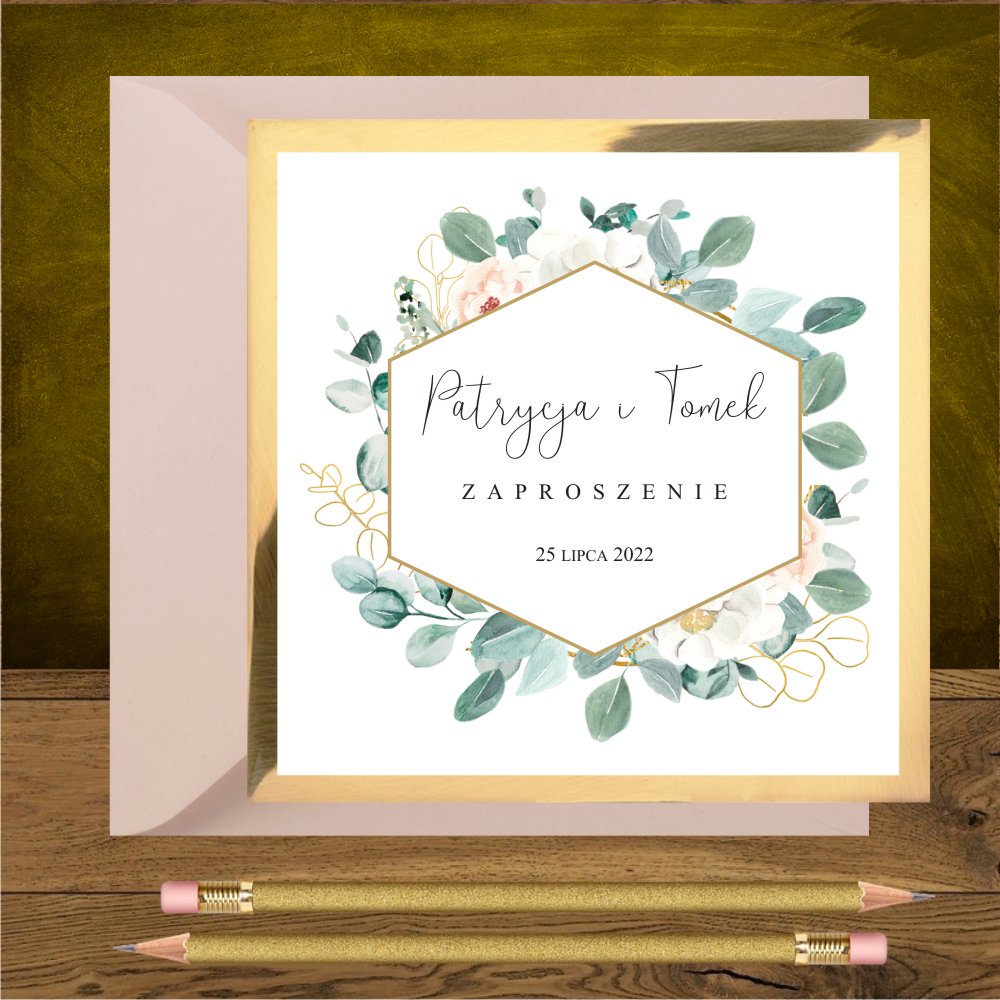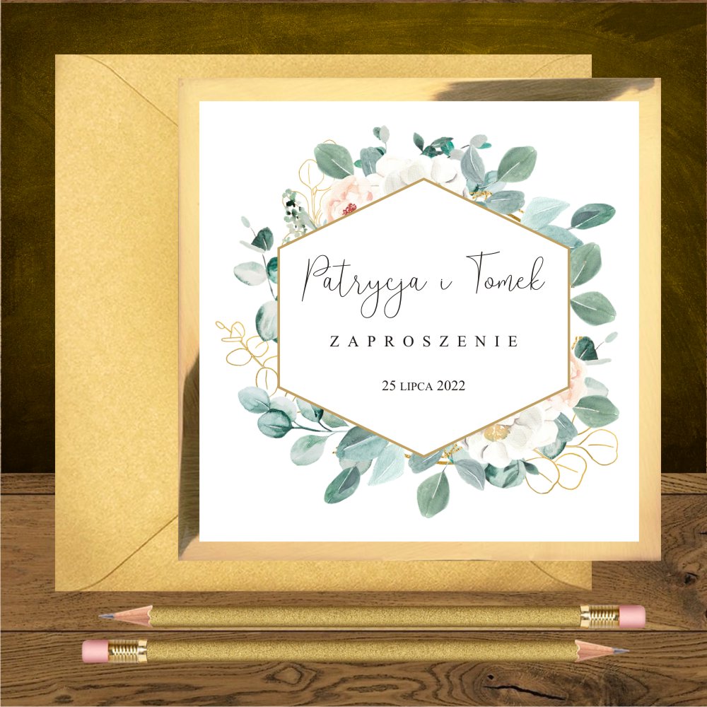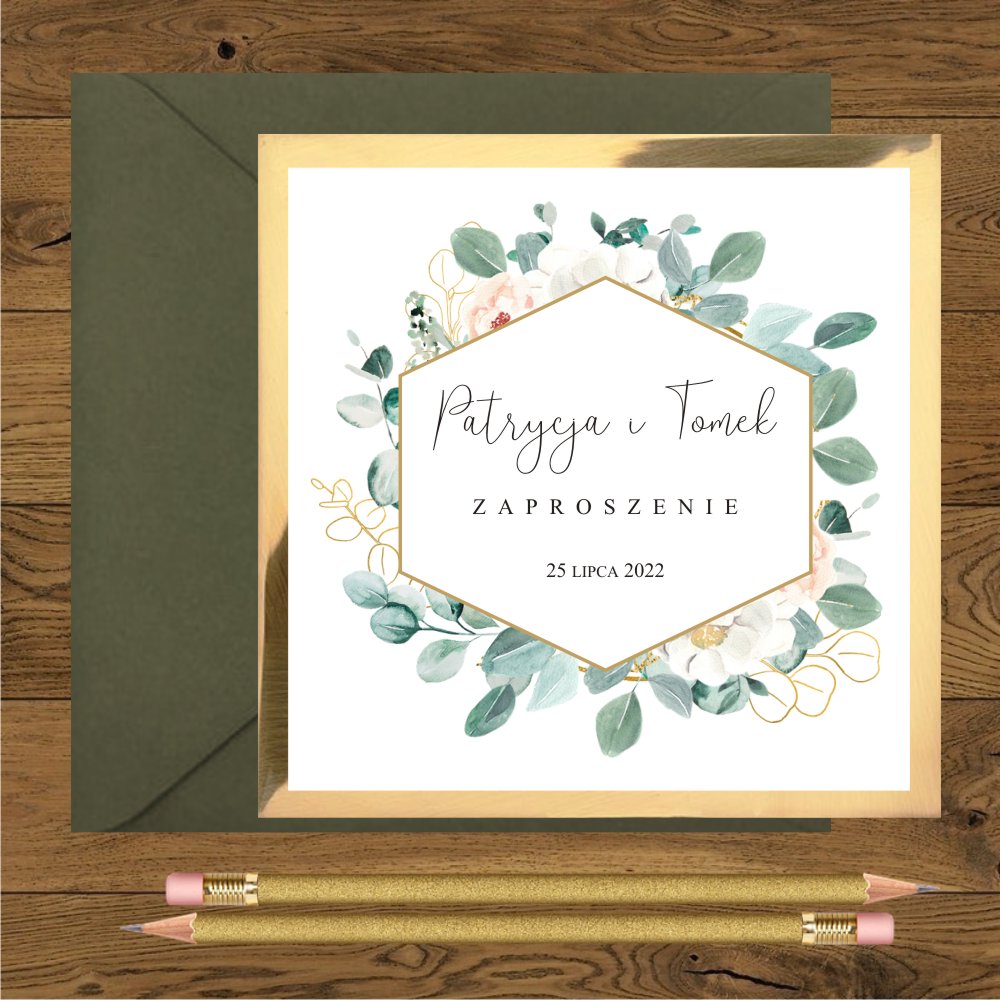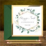 Zaproszenie ślubne zielone złote eukaliptus i heksagon