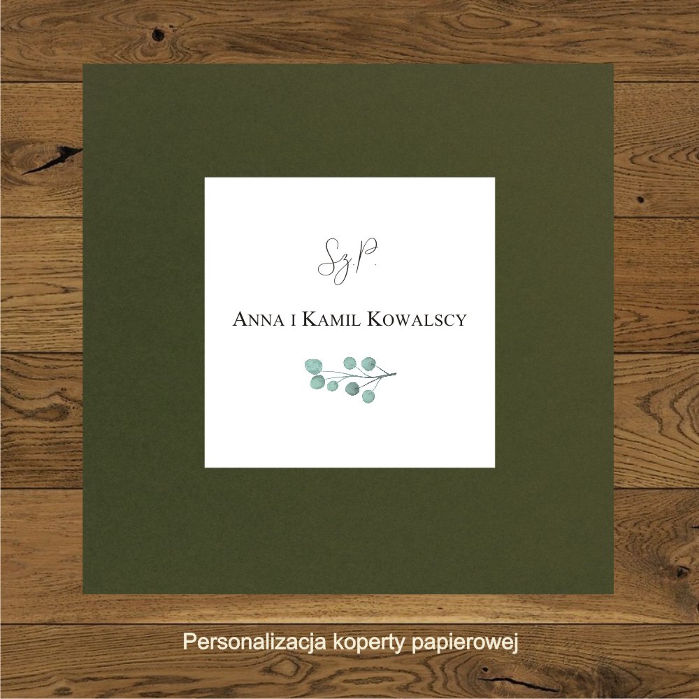 | Personalizacja koperty papierowej. Druk na papierze takim jak zaproszenia. W przykładzie koperta w kolorze zieleni butelkowej. Motyw gałązki eukaliptusa na froncie |