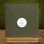 Naklejka na kopertę w kształcie kółeczka. Wykonana z papieru takiego jak użyty w zaproszeniach.W przykładzie koperta w kolorze zieleni butelkowej. Motyw gałązki eukaliptusa na naklejce. |