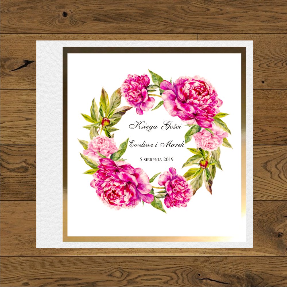 Księga gości weselnych Piwonie wianek ciemny róż , mirror złoty, księga biała