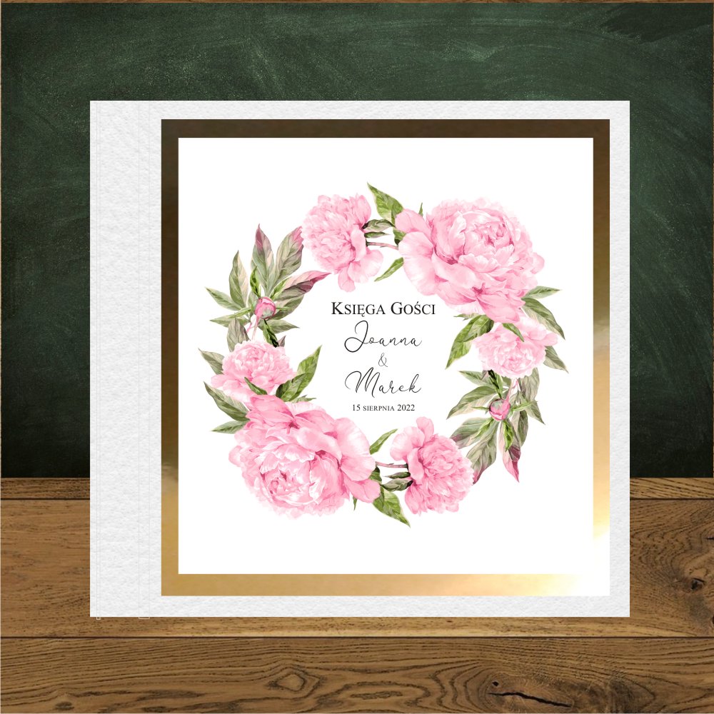 Księga gości do wpisów z uroczym wiankiem różowych piwonii.