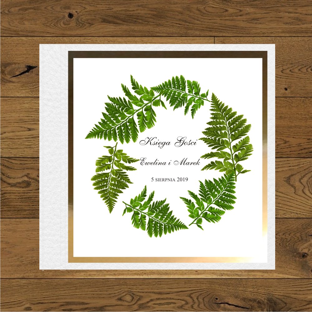 Zaposzenie ślubne z gałązkami paprotki. Kwadratowe, proste. Paprotka