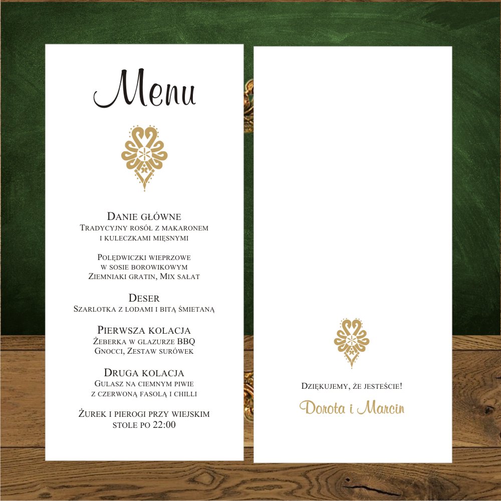Menu ślubne na stół weselny. Złota parzenica w stylu folk lub rustykalnym.