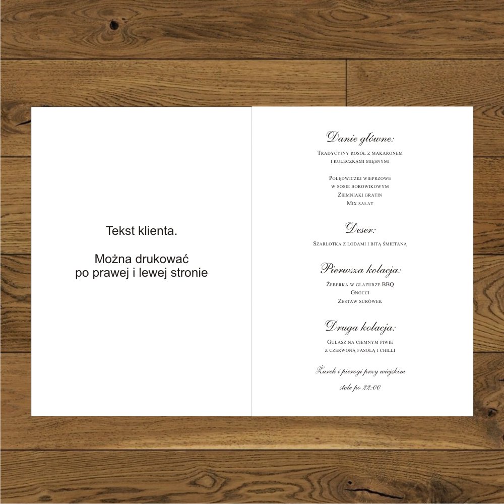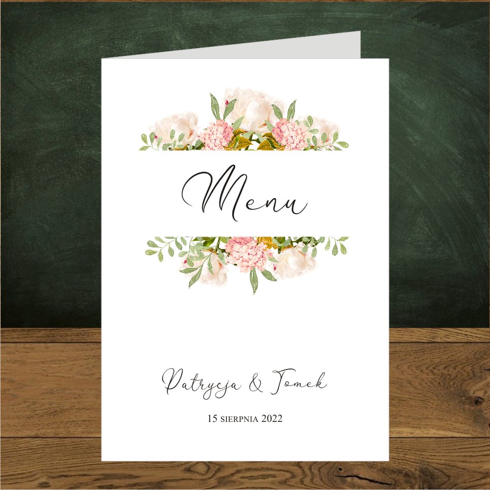 Menu na stół ślubny otwierane. Pastelowa kolorystyka hortensji i zielonych liści w stylu boho lub rustykalnym.