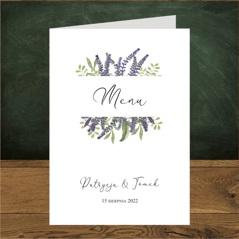 Menu na stół weselny otwierane. Lawendowy motyw w stylu boho lub rustykalnym.