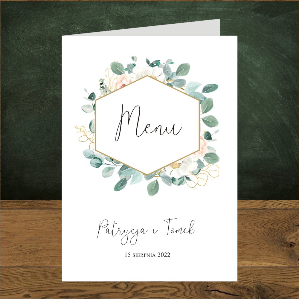 Zaproszenie ślubne zielone złote eukaliptus i heksagon