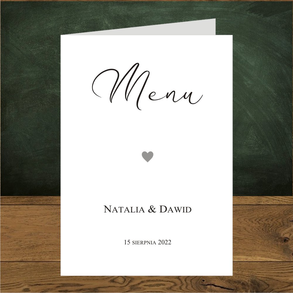 Menu ślubne na stół weselny otwierane.Proste minimalistyczne srebrne serduszko.