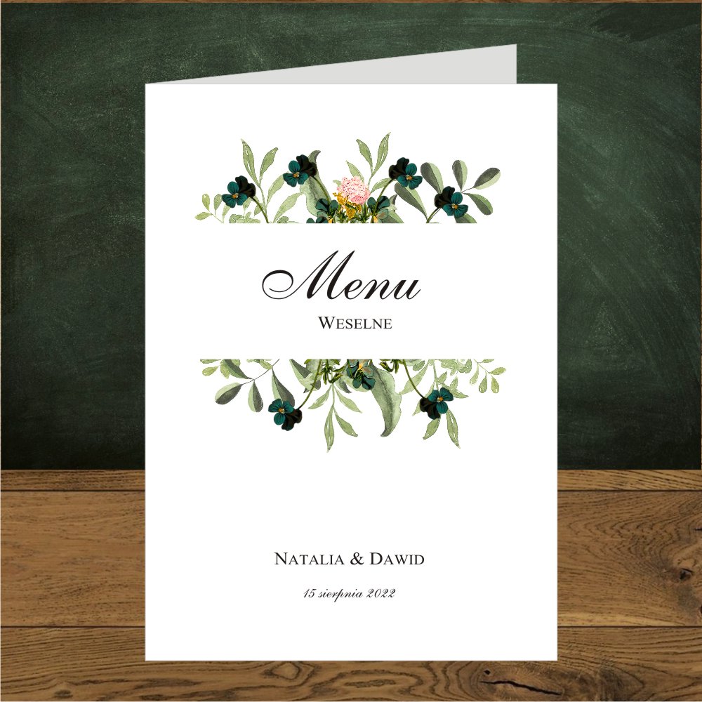 Menu ślubne na stół weselny otwierane. Motyw kwiatowy w zielono szmaragdowej kolorystyce w stylu boho lub rustykalnym.
