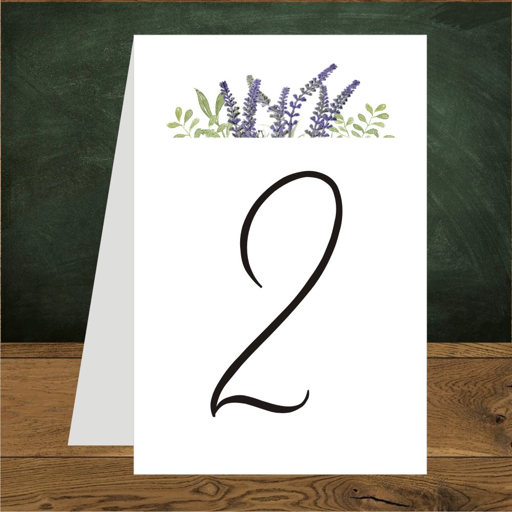 Numerki na stół ślubny. Motyw lawendy z zielonymi listkami w stylu rustykalnym.