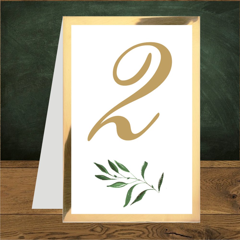 Numerki na stół weselny ze złotym podklejeniem. Zielone gałązki delikatne