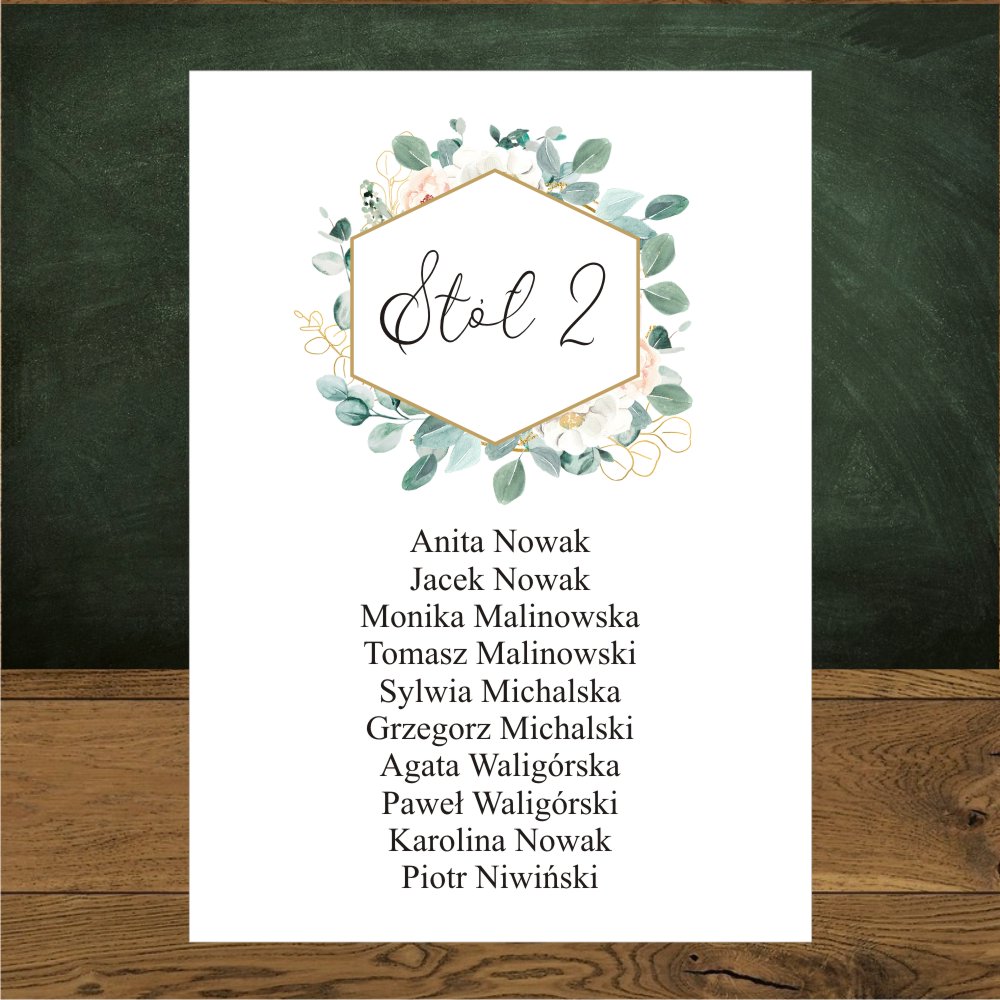 Plan stołów weselnych. Usadzenie Gości na weselu jest bardzo ważne. Personalizowane karteczki do samodzielnego montażu z eukaliptusem i geometrycznym motywem.