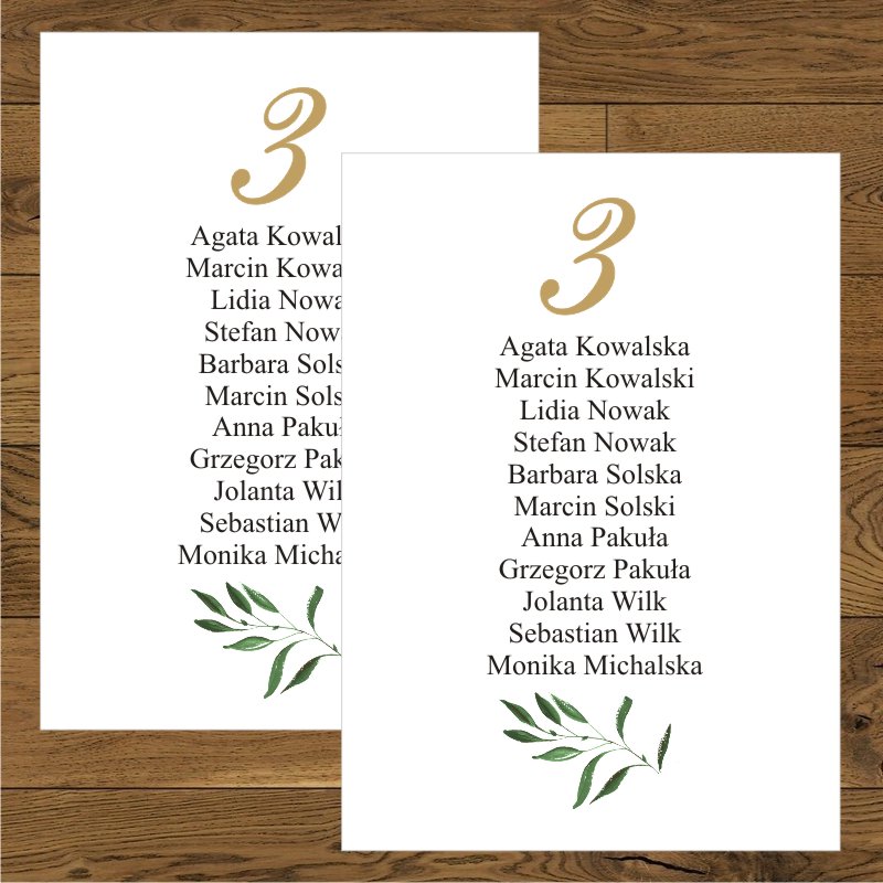 Numerki na stół weselny ze złotym podklejeniem. Zielone gałązki delikatne