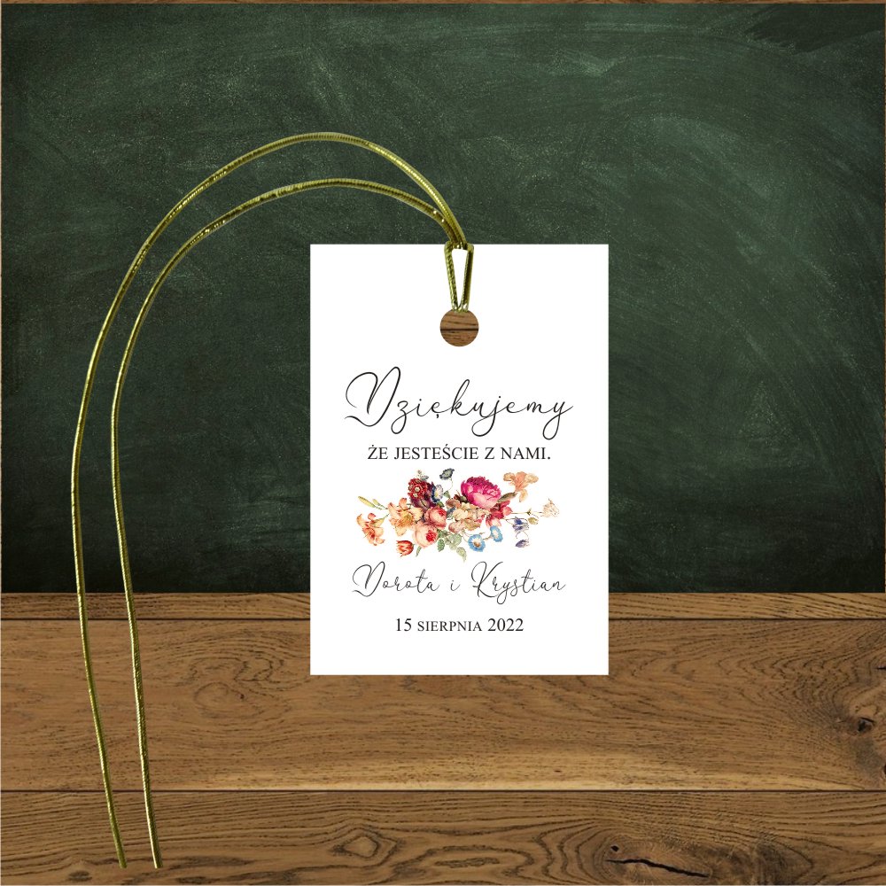 Zawieszki do prezentów to urocze bileciki z dziurką przewiązane rustykalnym sznurkiem, atłasową wstążką lub luksusową złotą lub srebrną gumką. Prezentowany stylowy wzór w kolorystyce bordo, złota i błękitu.