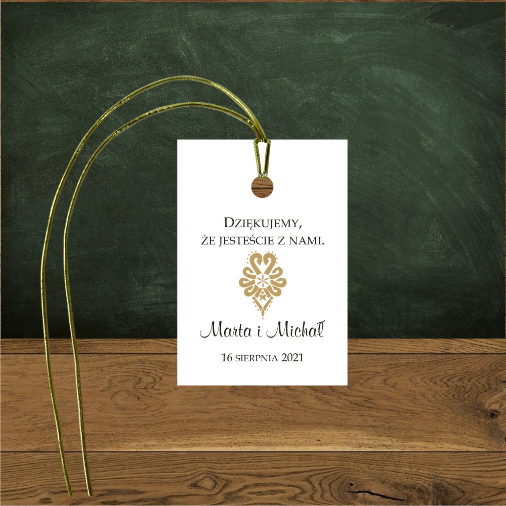 Prezenty dla gości weselnych najciekawsze są personalizowane, dlatego nieodzowne będą zawieszki do zawiązania prezencików. Te tutaj z folkowym motywem złotej parzenicy.