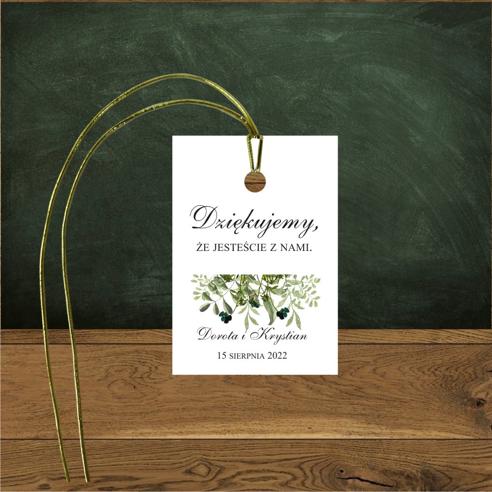 Zawieszki do prezentów to urocze bileciki z dziurką przewiązane rustykalnym sznurkiem, atłasową wstążką lub luksusową złotą lub srebrną gumką.Prezentowany wzór z piękną boho grafiką z zielonymi listkami i szmaragdowymi kwiatkami.