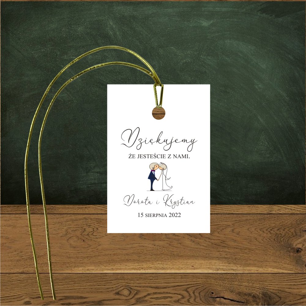 Podziękowania dla gości weselnych najciekawsze są personalizowane, dlatego nieodzowne będą zawieszki do zawiązania prezencików. Te tutaj z wesołym, śmiesznym motywem Pary Młodej