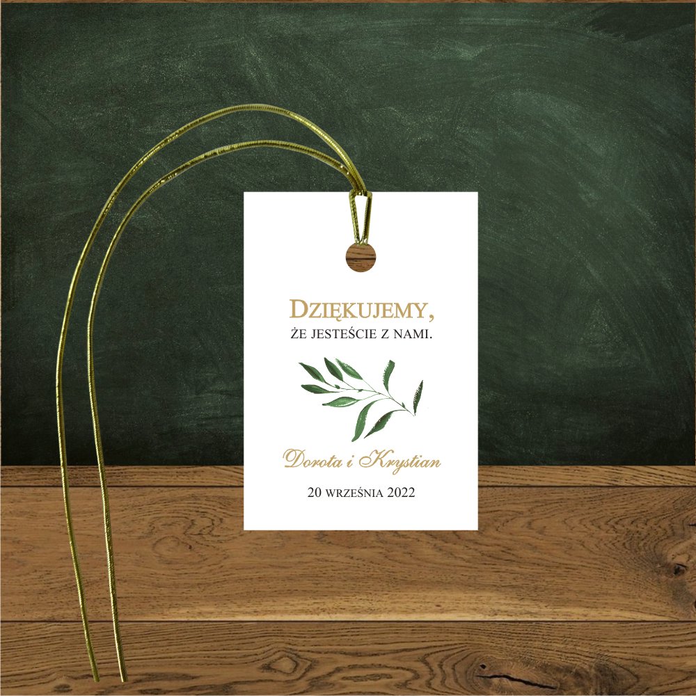 Zawieszki na alkohol weselny ze złotym podklejeniem. Zielone gałązki delikatne