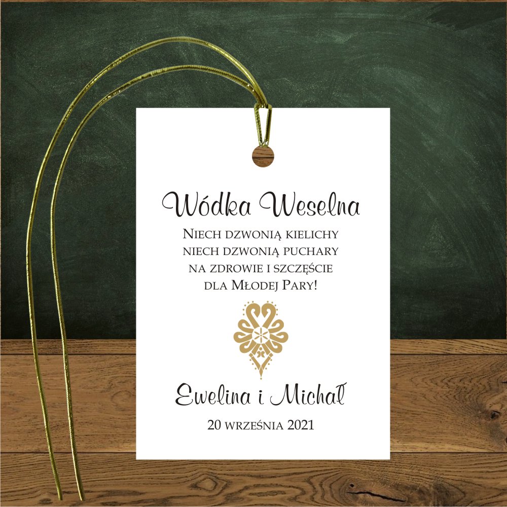 Zawieszki na wódkę weselną będą niezwykłą ozdobą stołu weselnego, szczególnie dopasowane stylistyką do reszty papeterii ślubnej. Piękny folokowy wzór ze złotą parzenicą.