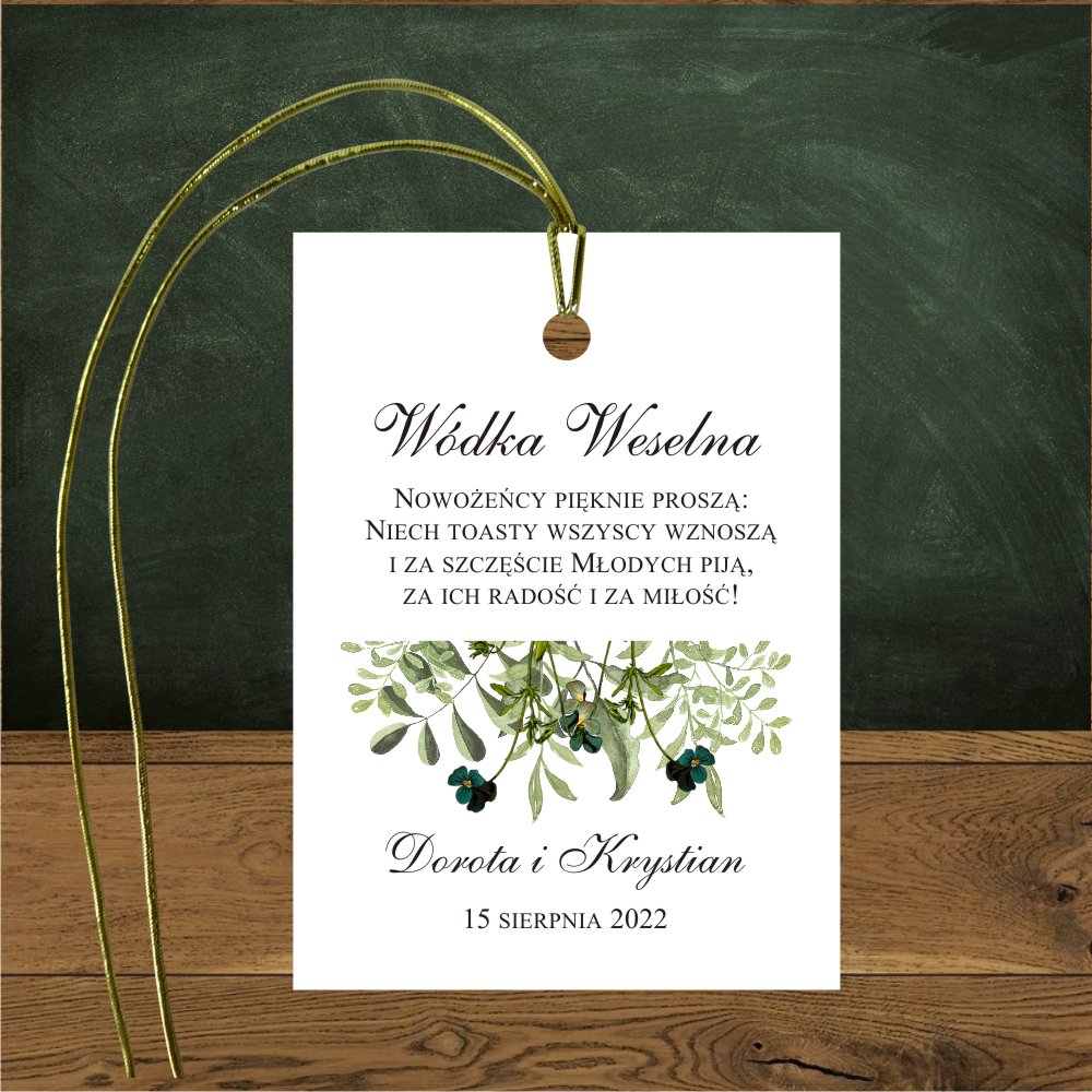 Zawieszki na alkohol będą niezwykłą ozdobą stołu weselnego, szczególnie dopasowane stylistyką do reszty papeterii ślubnej.Wzór z delikatnymi zielonymi gałązkami i szmaragdowymi kwiatuszkami.