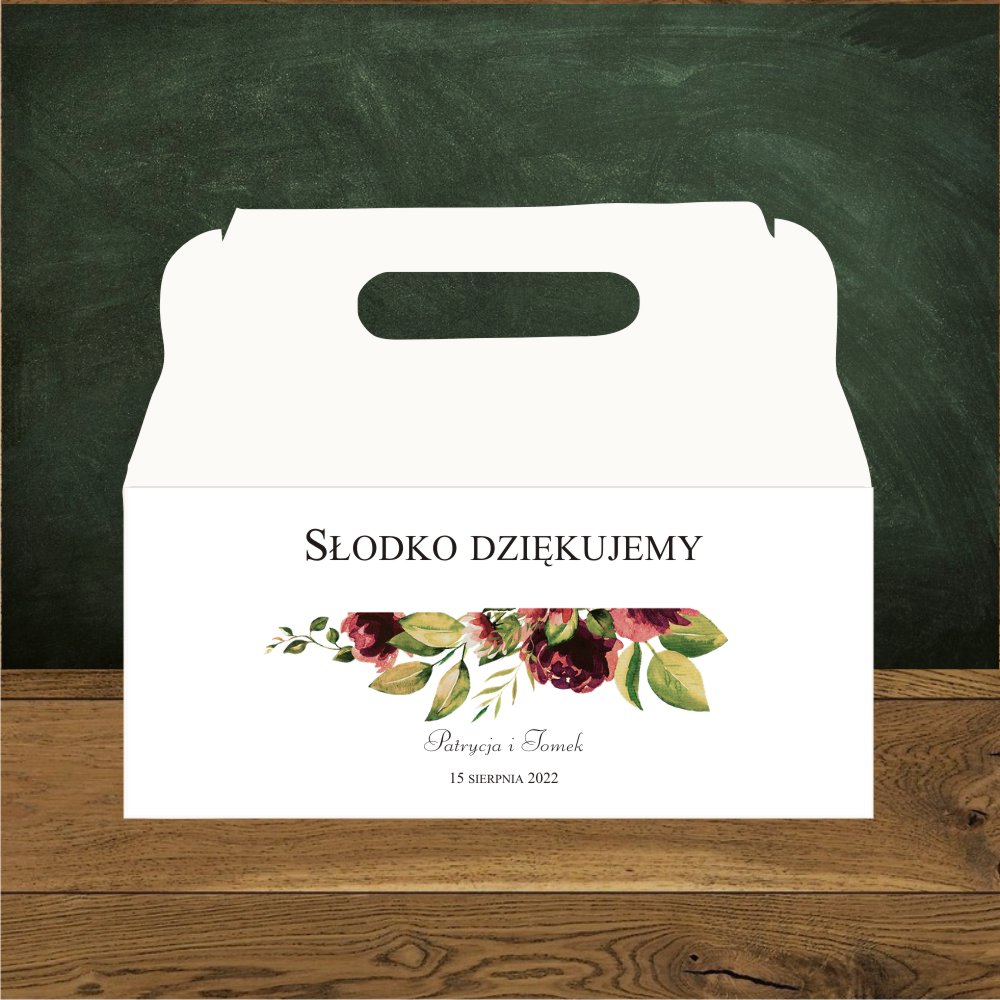 Pudełka na ciasto weselne - Kwiaty bordo i gałązki